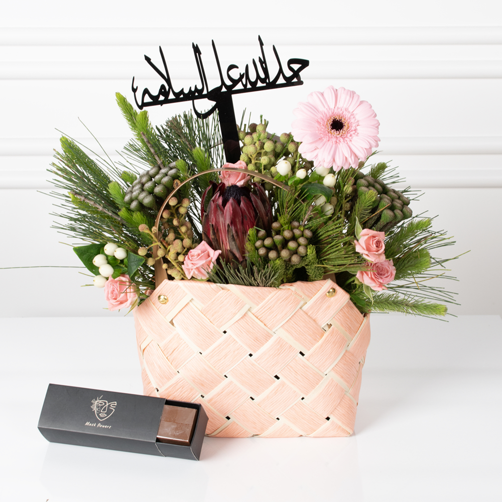 A beautifully arranged straw basket with Dutch safari flowers, baby roses, and gerberas, along with a small chocolate box and a topper.
