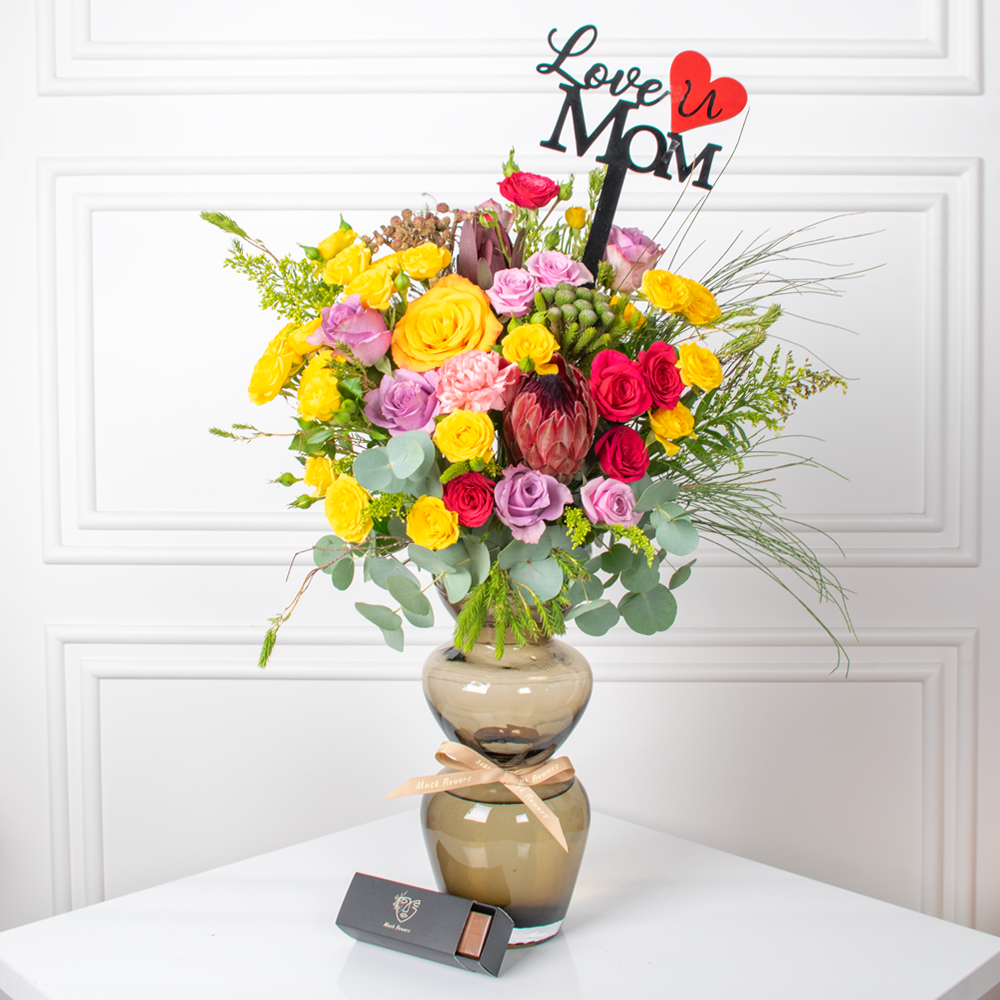 A bouquet containing roses, baby roses, and orchids arranged beautifully in a stand.