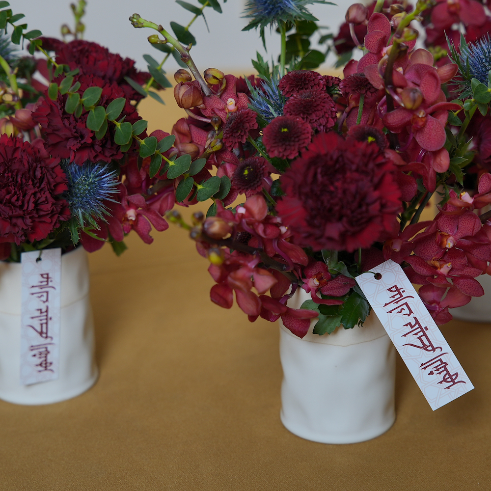 A set of 3 vases beautifully arranged with orchids, chrysanthemums, and carnations, comes with a Ramadan tag. An elegant display, perfect for the holy month.