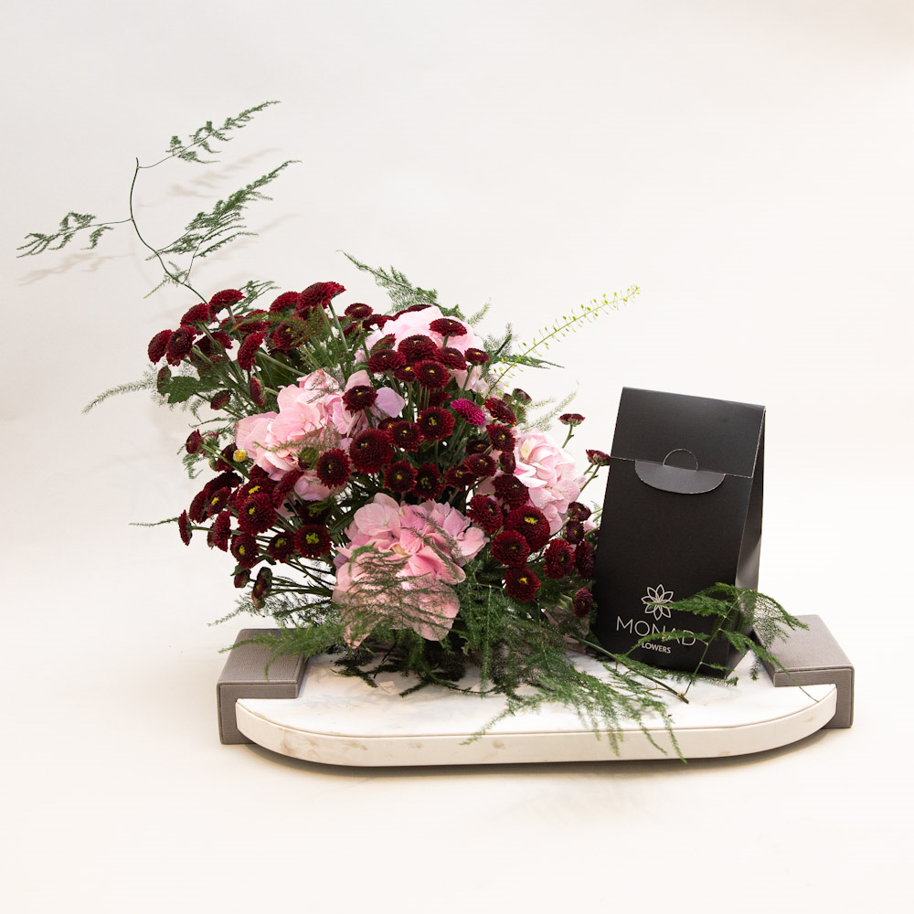 A graceful tray featuring soft pink hydrangeas and deep burgundy chrysanthemums arranged with delicate greenery, paired with a box of luxury Belgian chocolate. An exquisite gift choice for elegant celebrations and heartfelt occasions.