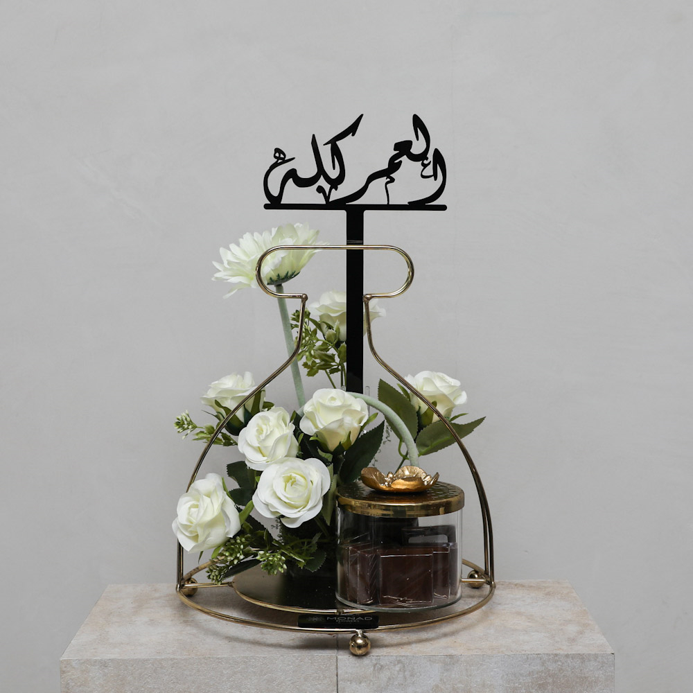 A modern golden sculptural frame, this elegant arrangement features soft white roses and delicate florals accented with a luxurious container filled with premium Belgian chocolate, making it ideal for thoughtful gifting and special occasions.