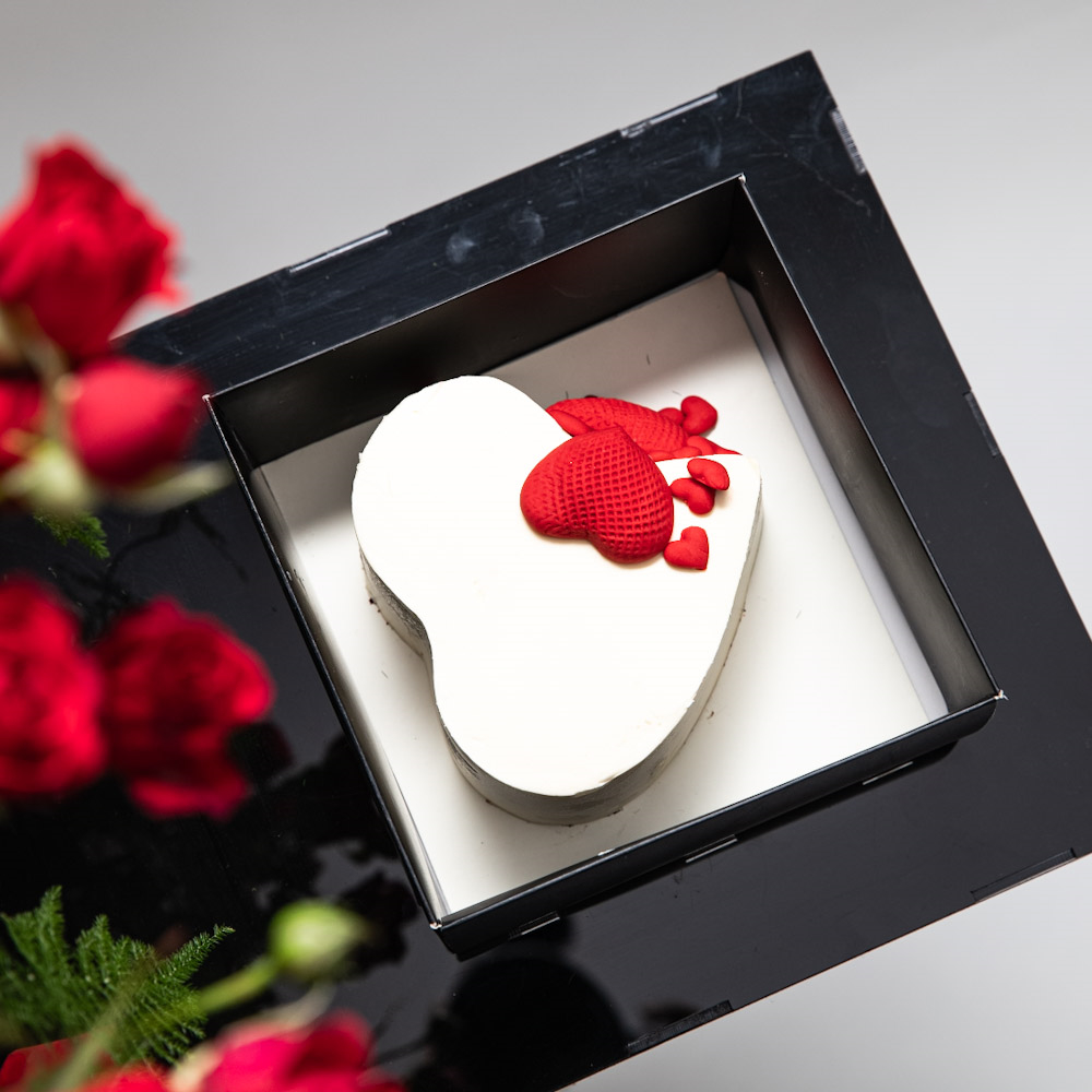 A refined love set featuring a lush red rose arrangement paired with a heart-shaped cake, presented on a modern tray. Designed to celebrate love with elegance and warmth, this piece creates a complete romantic experience.