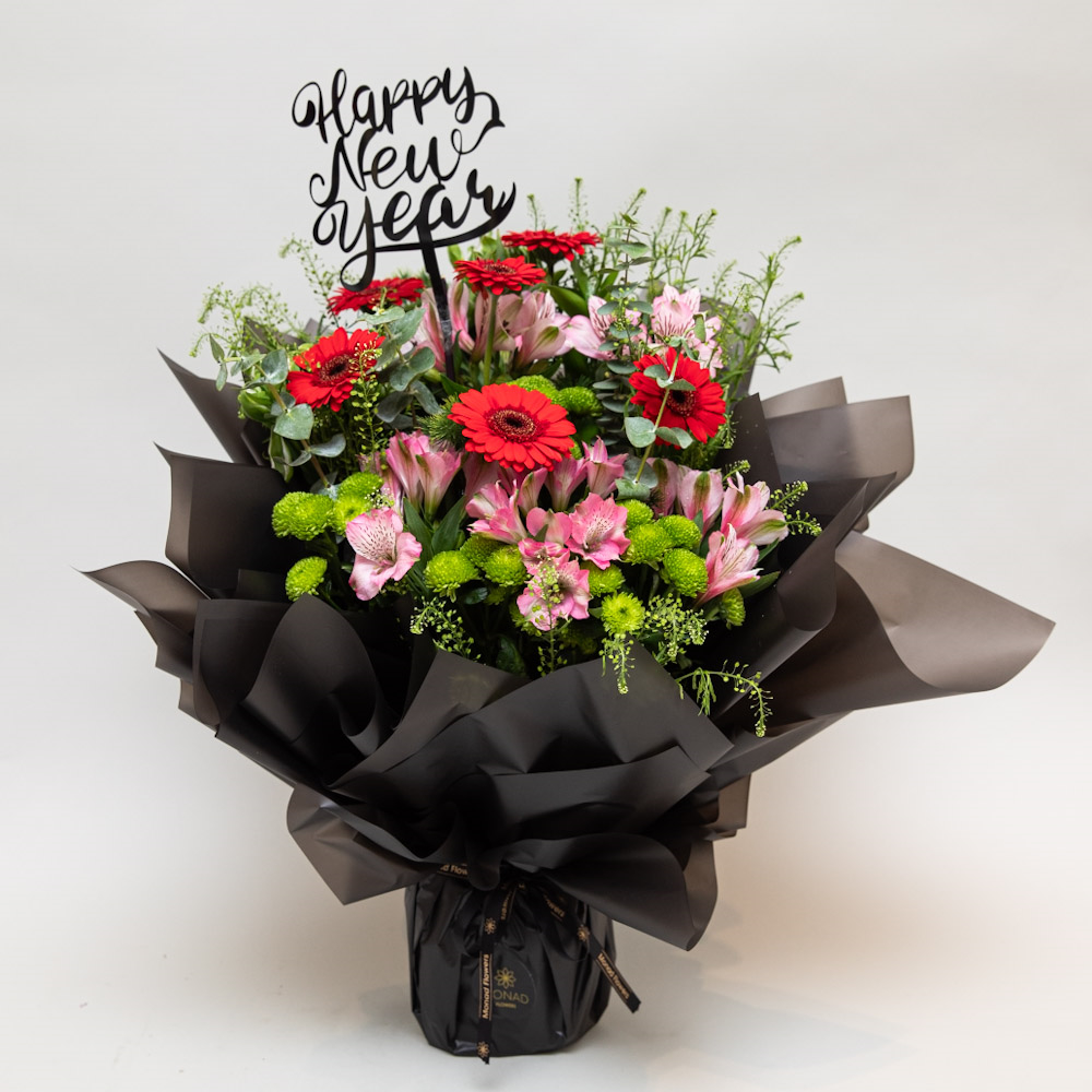 A festive bouquet with red gerberas, pink alstroemeria, and fresh greenery, topped with a “Happy New Year” sign. A joyful and vibrant gift to welcome the new year beautifully.