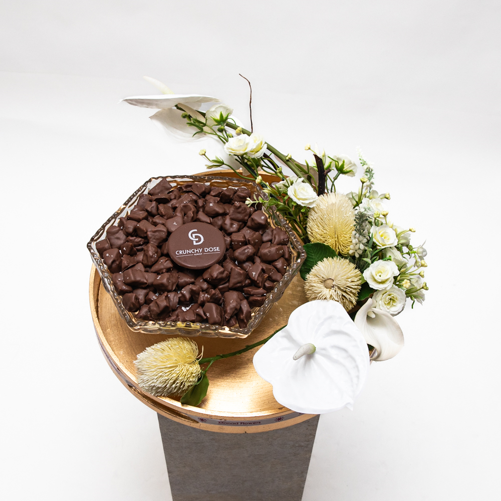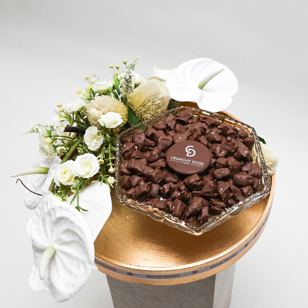 Presented on an elegant gold tray, this striking arrangement features preserved dried white calla lilies, roses, and anthuriums. Paired with a crystal bowl of premium Belgian crunchy chocolate bites filled with honey. A luxurious hospitality piece, perfect for elegant Ramadan evenings.