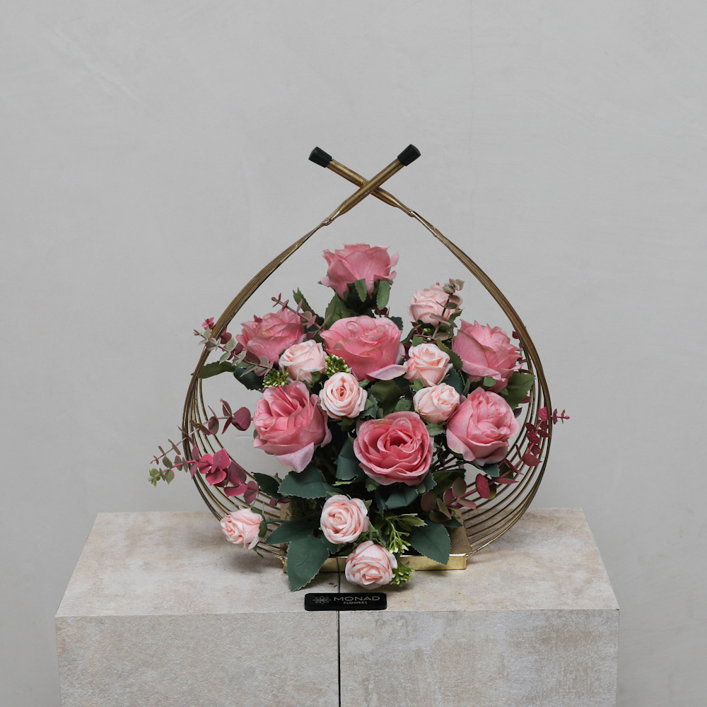 A modern golden sculptural frame, this elegant arrangement features soft blush roses paired with delicate florals and fresh greenery designed with graceful balance and timeless charm, perfect for thoughtful gifting and special occasions.