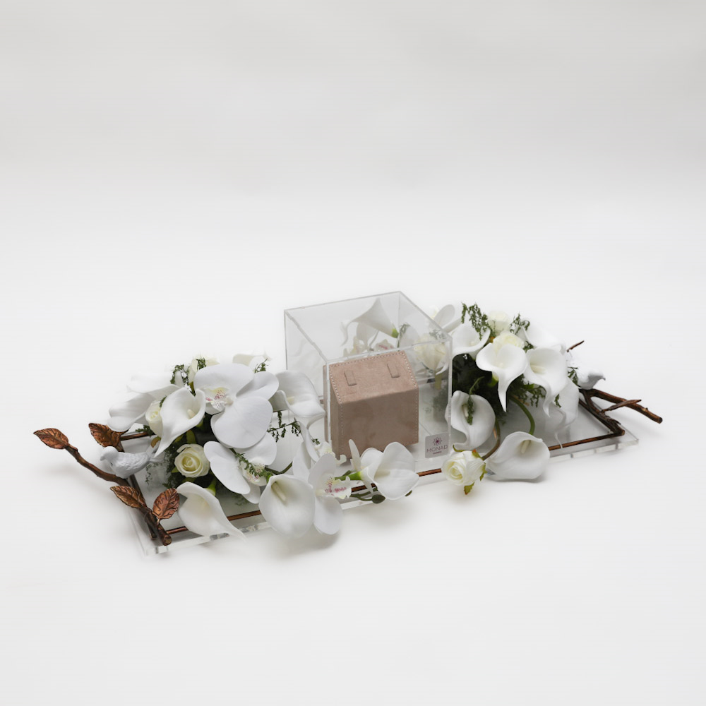 An elegant bridal set with a luxurious design in a refined style that reflects sophistication and a new beginning filled with calla lilies, with touches that express purity and a serene start.