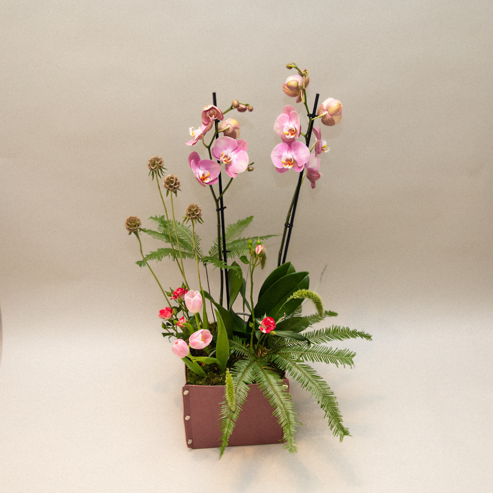 A bouquet that contains roses, orchids, tulips and celosia.