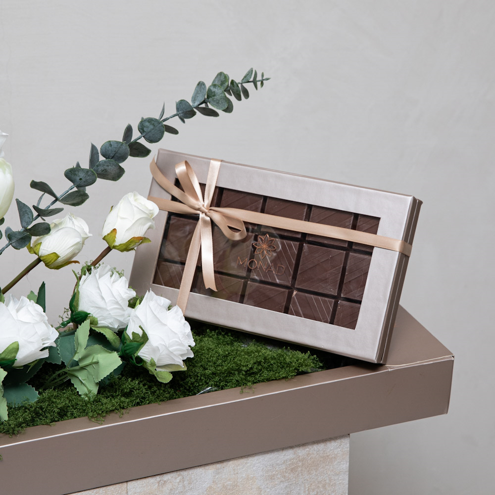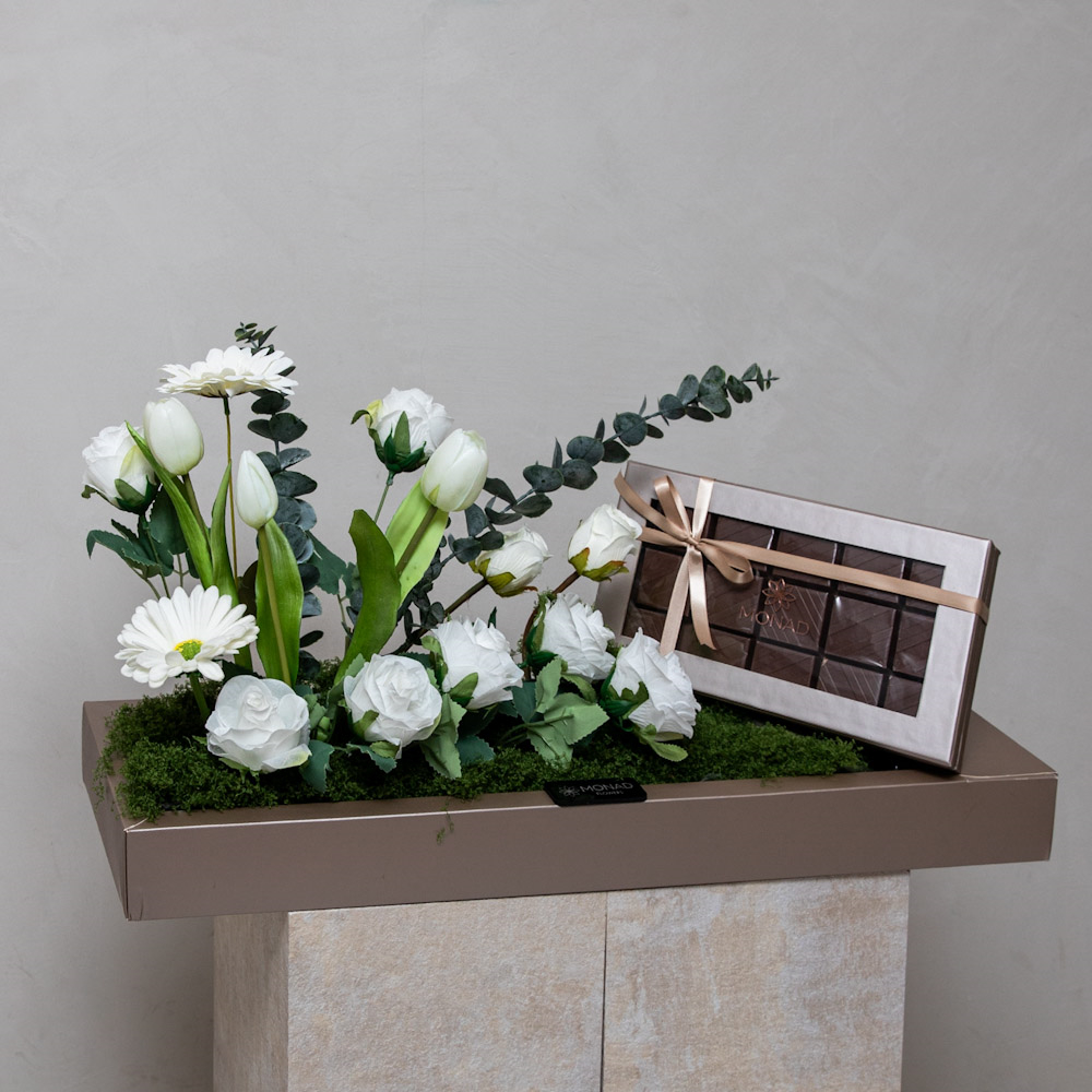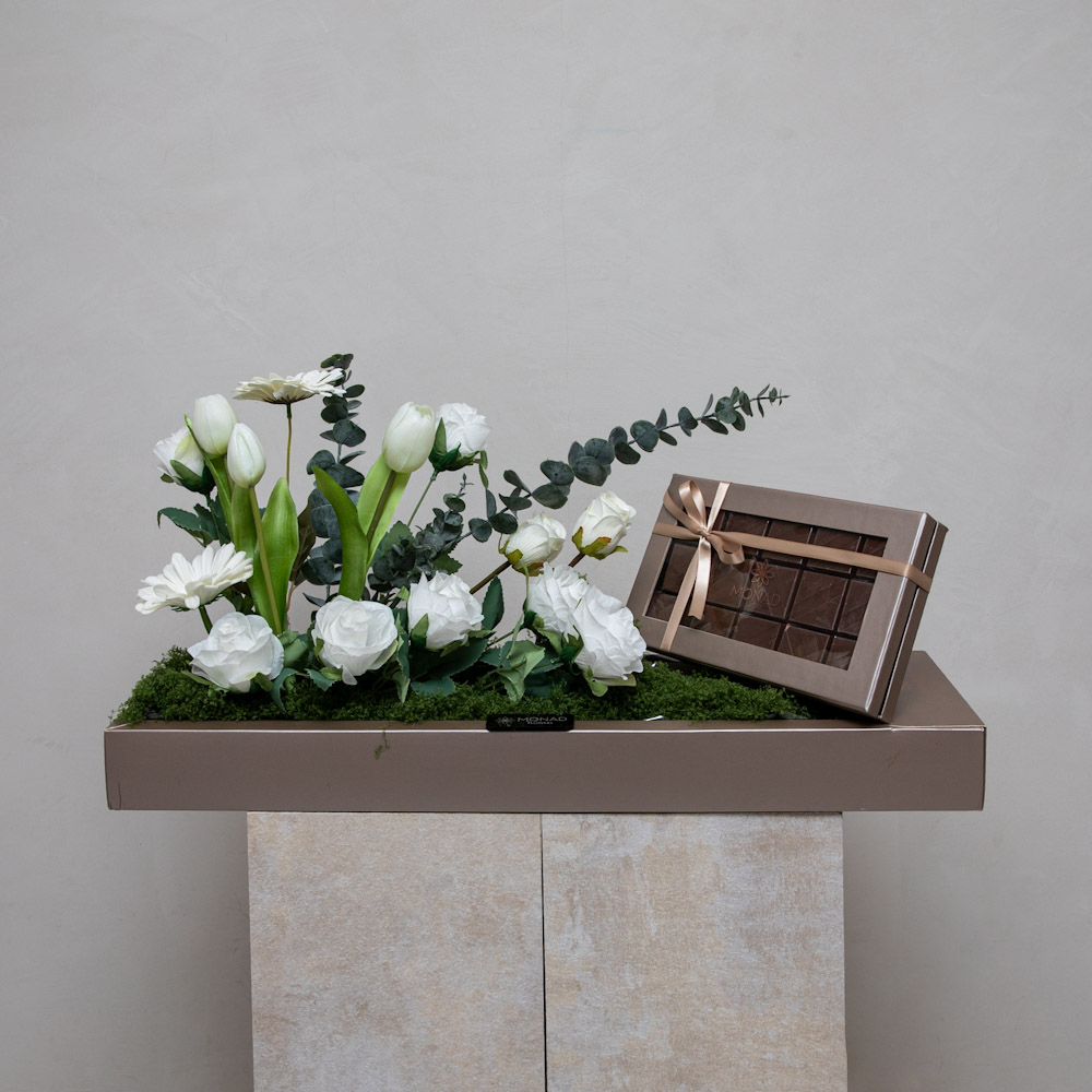 An elegant box that contains roses, tulips and eucalyptus leaves along with premium Belgian chocolates.