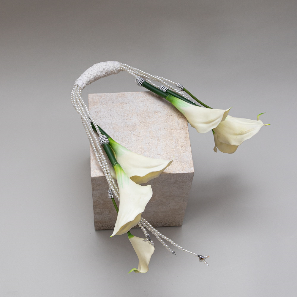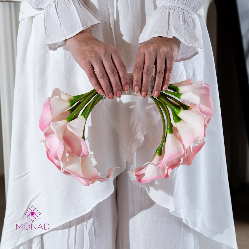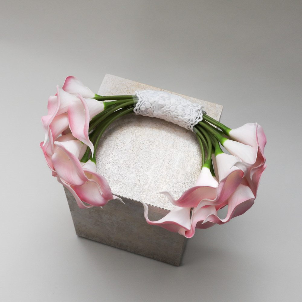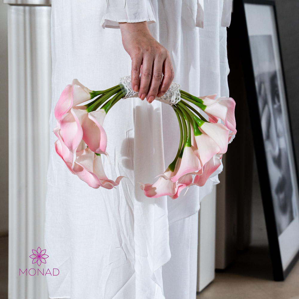A refined bridal bouquet featuring soft blush calla lilies, elegantly shaped into a graceful silhouette. Delicate, modern, and effortlessly luxurious. A timeless piece designed to complement the beauty of the bride on her special day.
