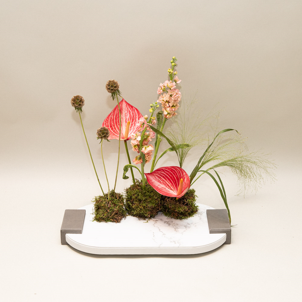 Delicate layers arranged in graceful rhythm, like opal tones catching the light. A serene, modern composition of anthurium and matthiola flowers that feels polished and poetic at once.
