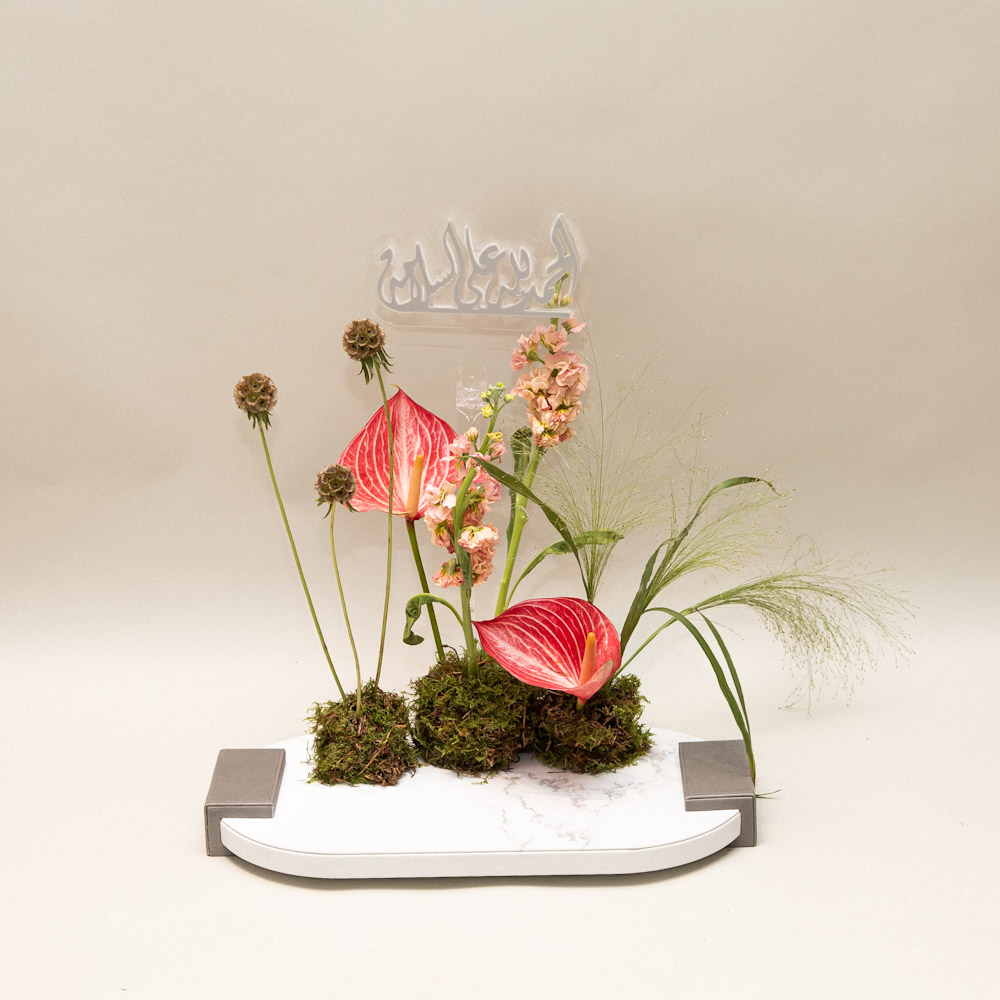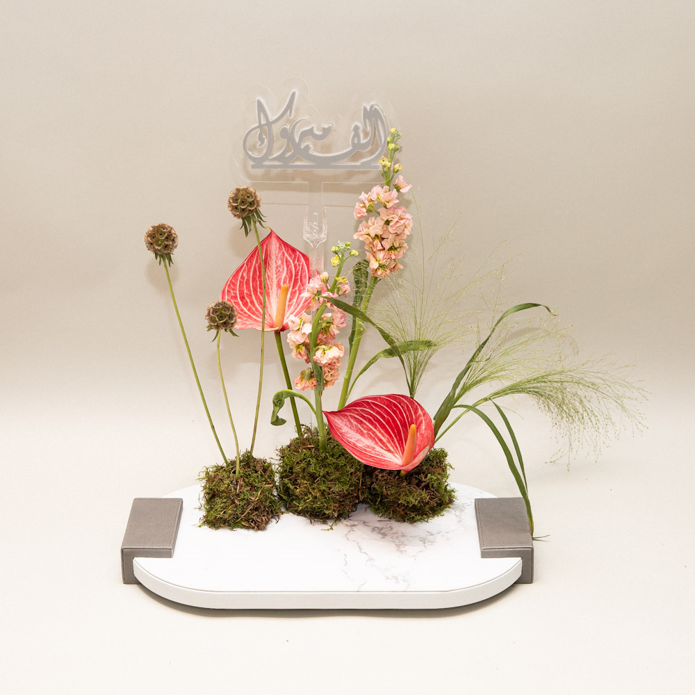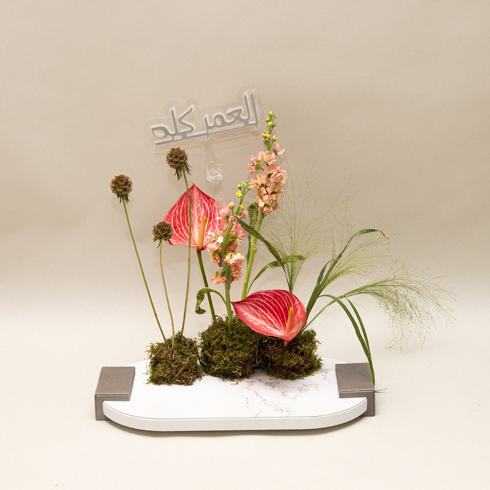 Presented in a modern luxurious marble base, this artistic arrangement features striking pink anthurium blooms paired with soft blush stock flowers, sculptural stems, and airy greenery. A refined and contemporary composition, perfect for sophisticated gifting or adding a serene, artistic touch to elegant spaces.