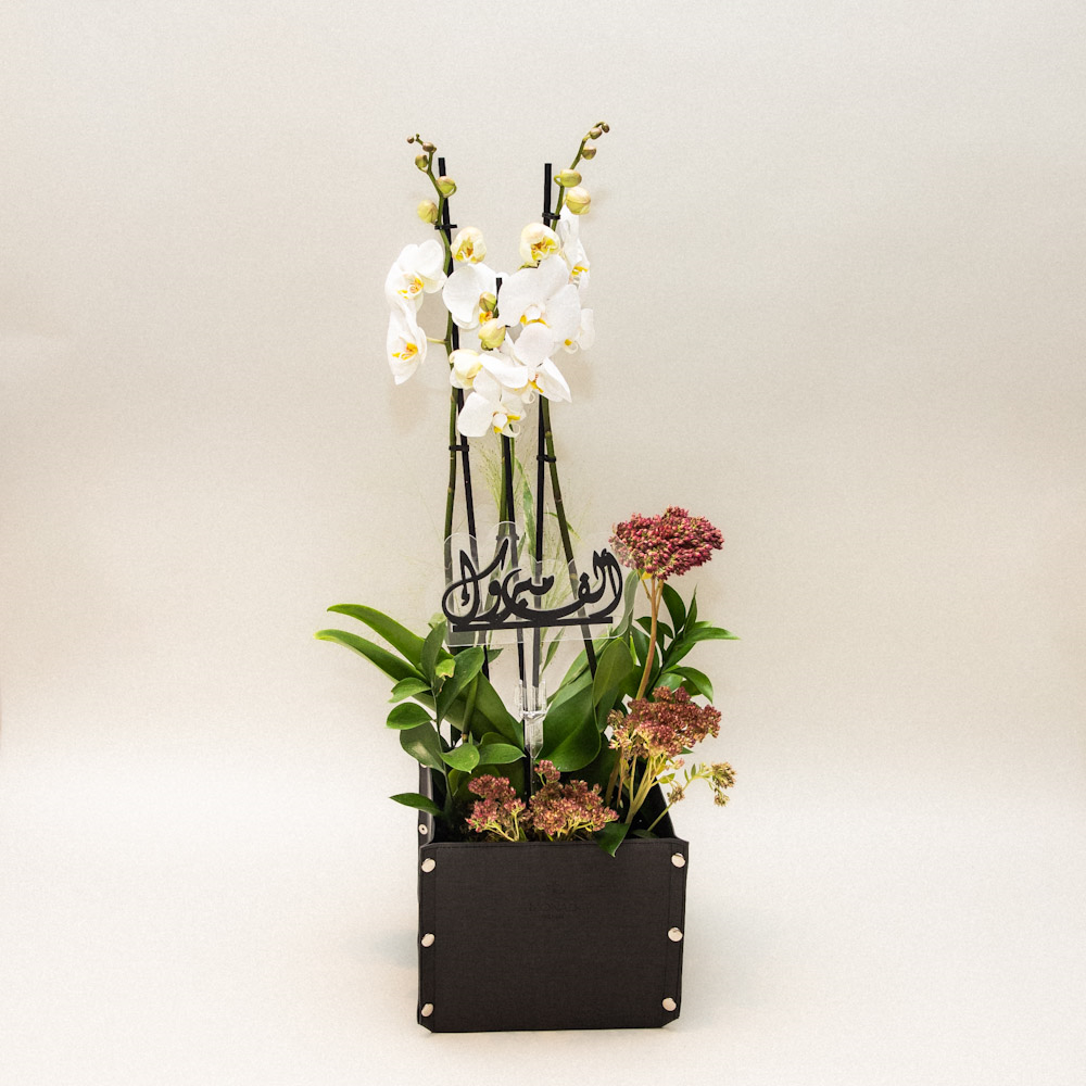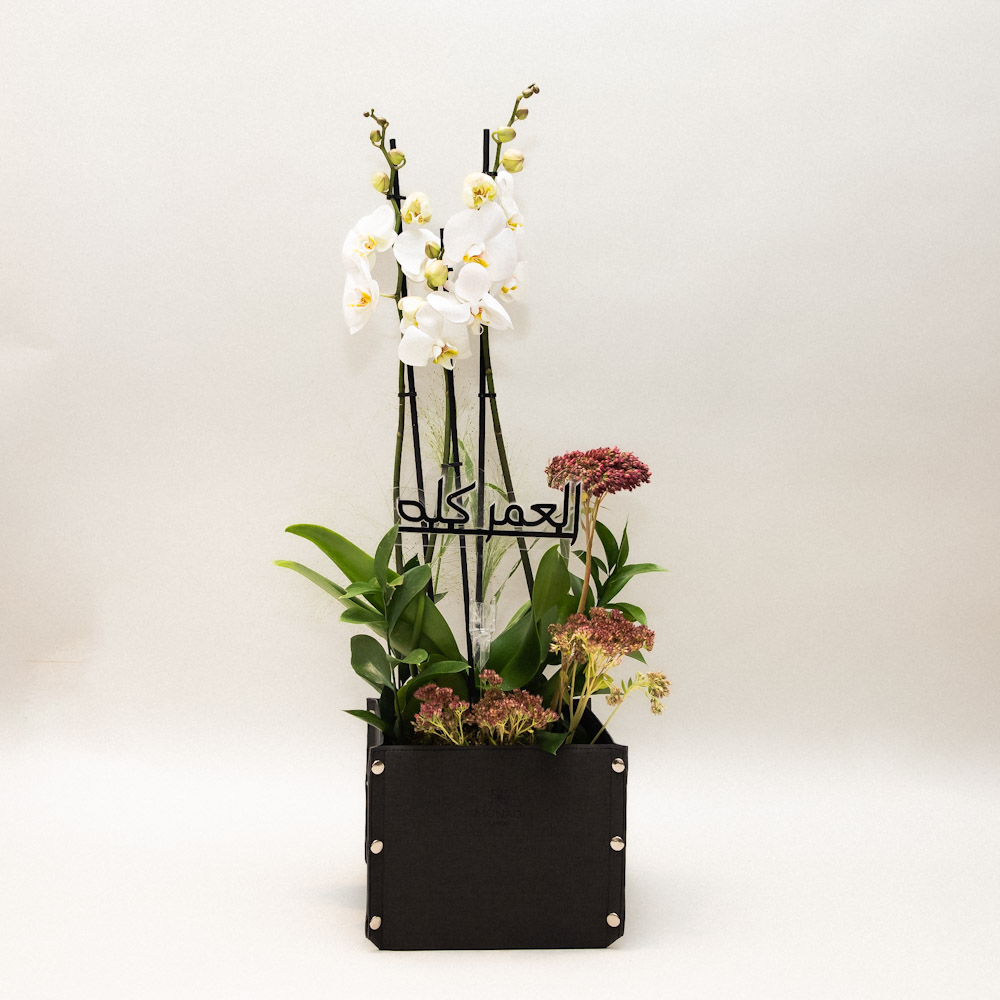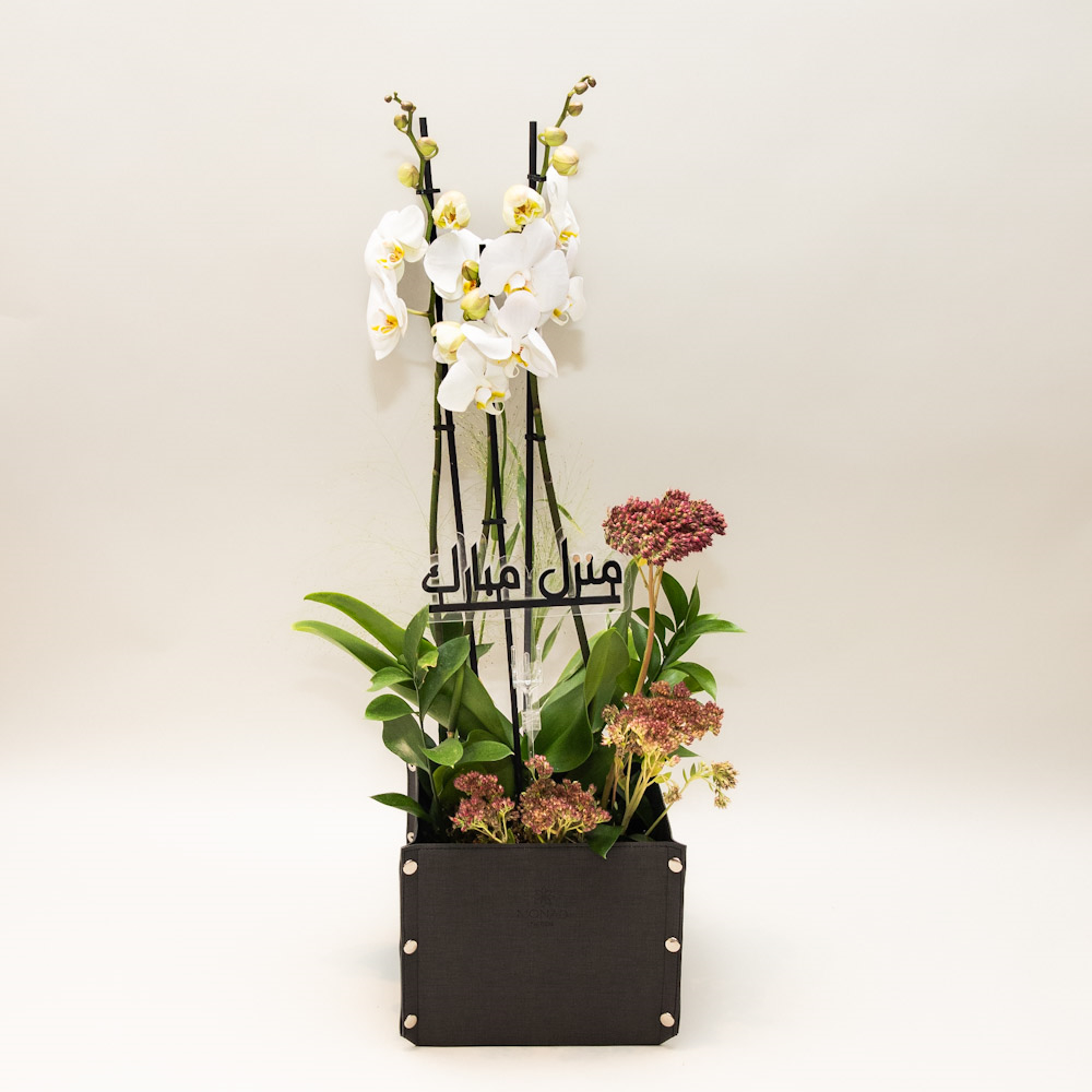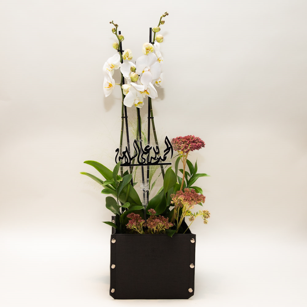 Presented in a modern luxurious leather base, this elegant arrangement features pristine white orchid stems complemented by textured greenery and delicate seasonal blooms. A timeless and sophisticated piece, perfect for refined gifting or enhancing any elegant space.