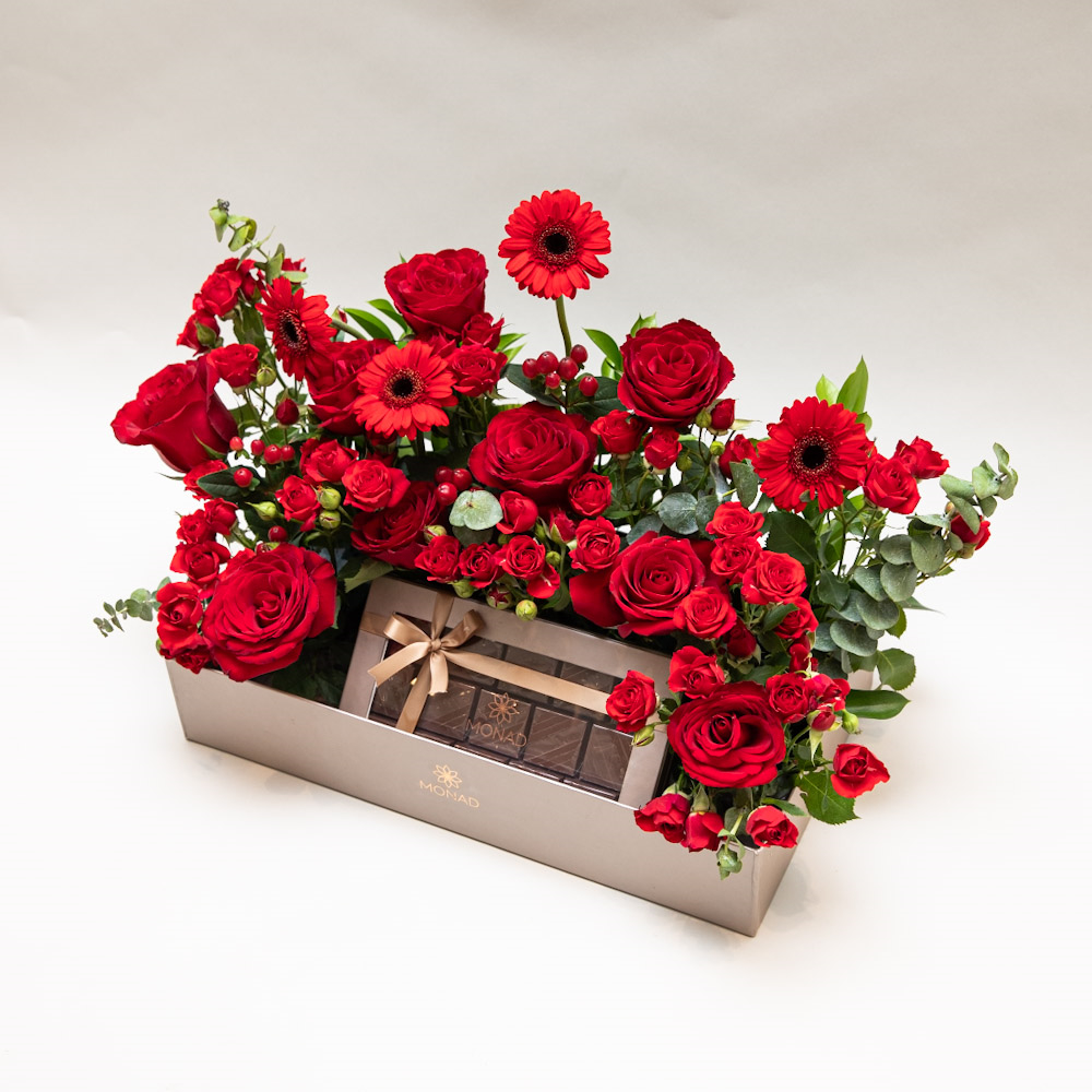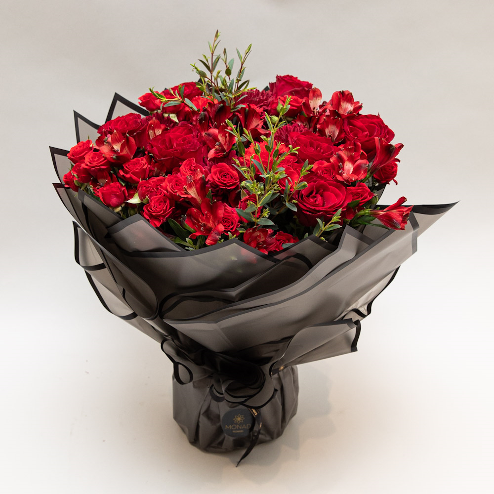 This elegant arrangement features soft blush roses, delicate pink gerberas, and graceful tulip buds, accented with cascading seasonal blooms and refined eucalyptus greenery. A romantic yet contemporary design, perfect for heartfelt gifting or adding a touch of refined charm to any space.