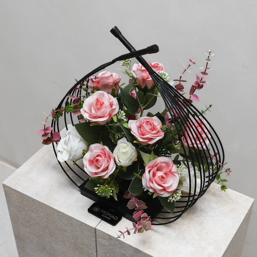 A modern sculptural frame, this refined arrangement features soft blush and white roses paired with delicate florals and fresh greenery. Designed with artistic balance and contemporary elegance, perfect for thoughtful gifting and elevating special moments.