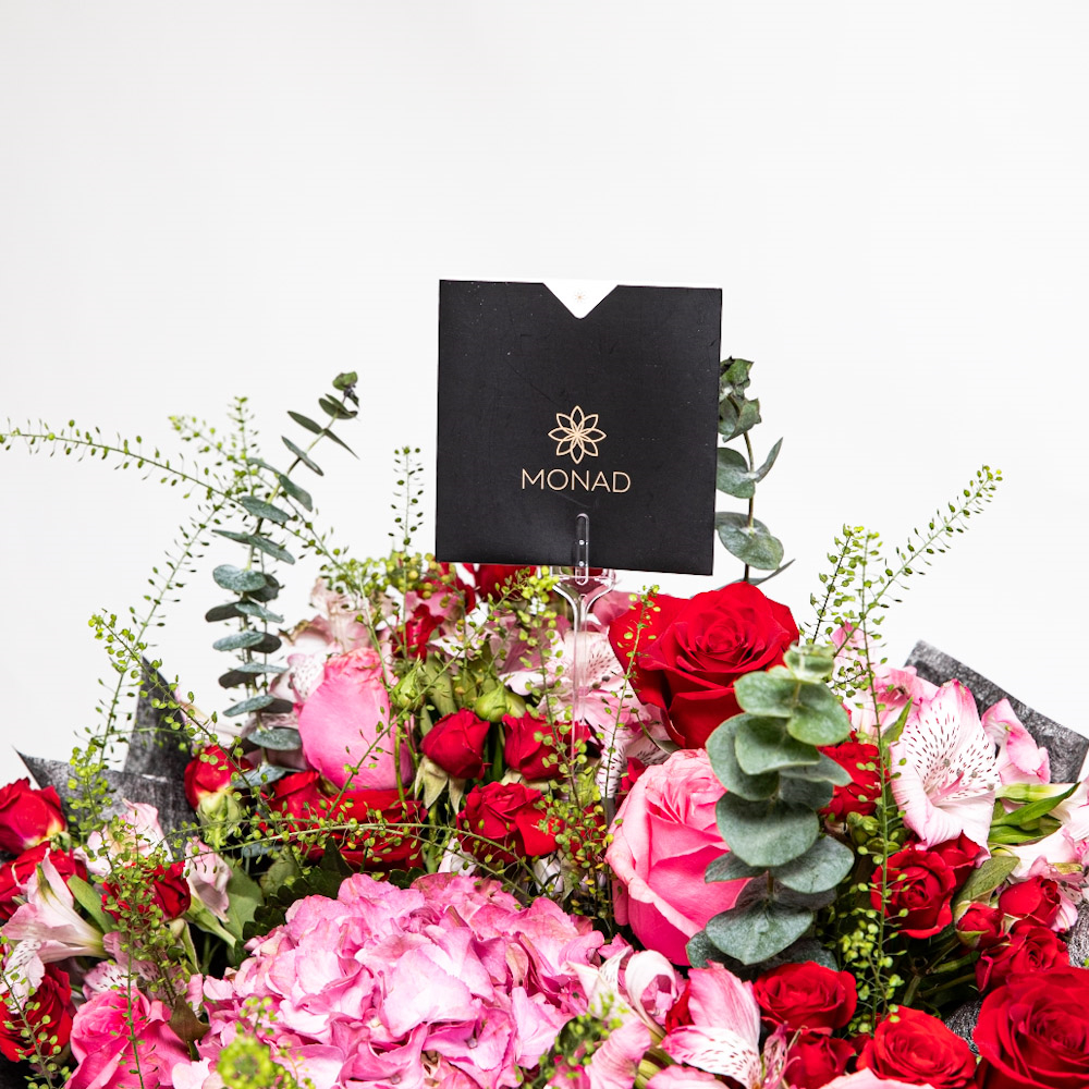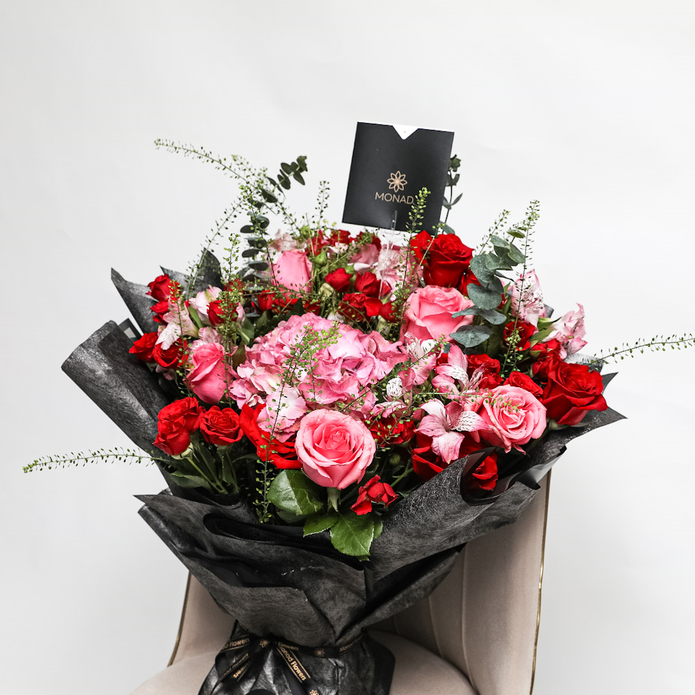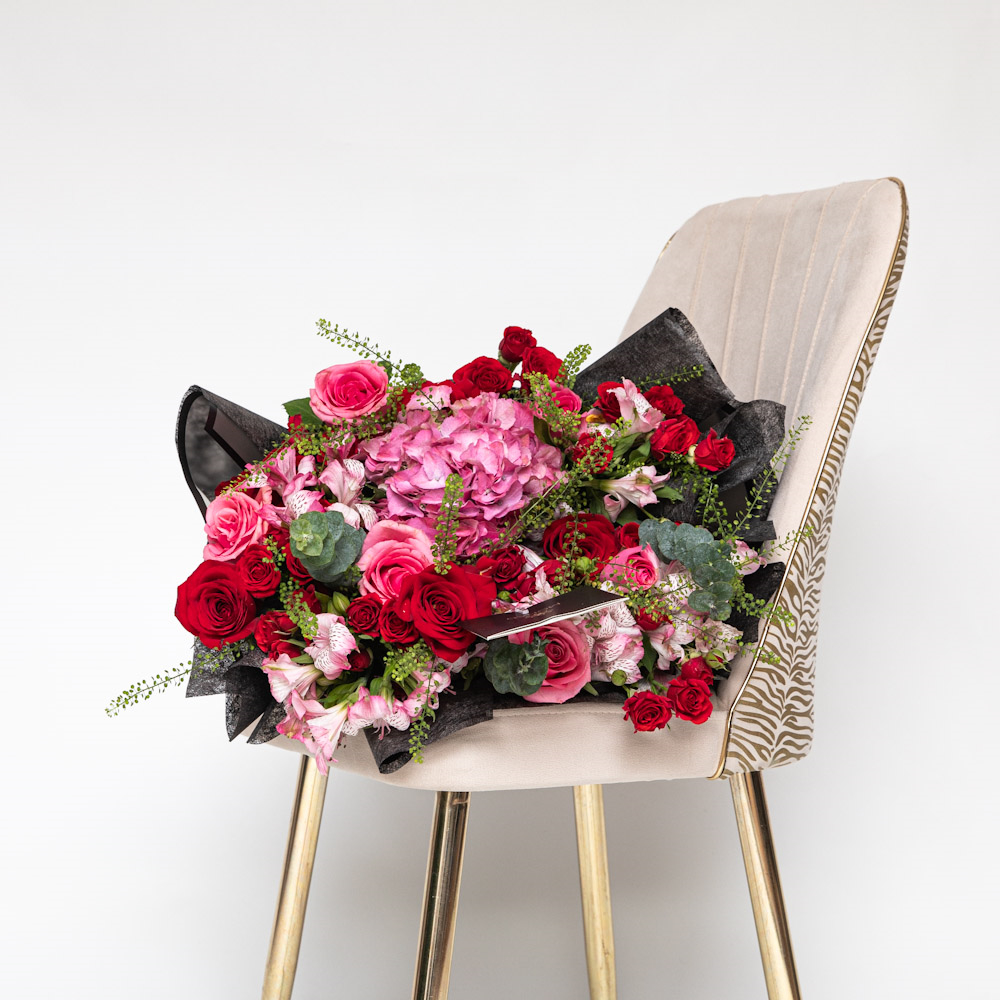 A romantic bouquet blending rich roses, baby roses, hydrangeas, and alstroemerias, wrapped in elegant black paper. Full of contrast and charm, this bouquet expresses tenderness and passion in perfect harmony.