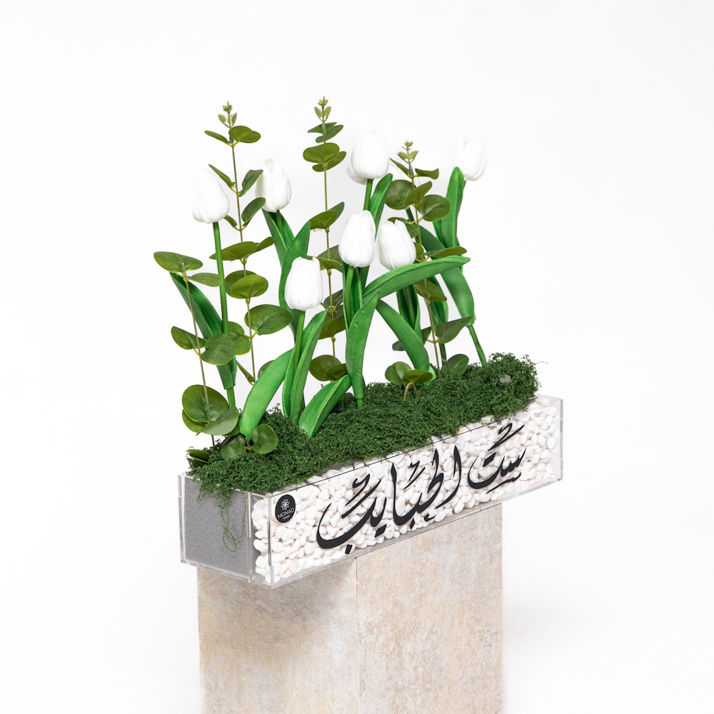 Presented in a sleek modern base adorned with white stones, this refined arrangement features preserved dried white tulip blooms accented with fresh green foliage, creating a clean and graceful composition. A timeless and elegant piece, perfect for celebrating Mother’s Day with warmth, love, and appreciation.