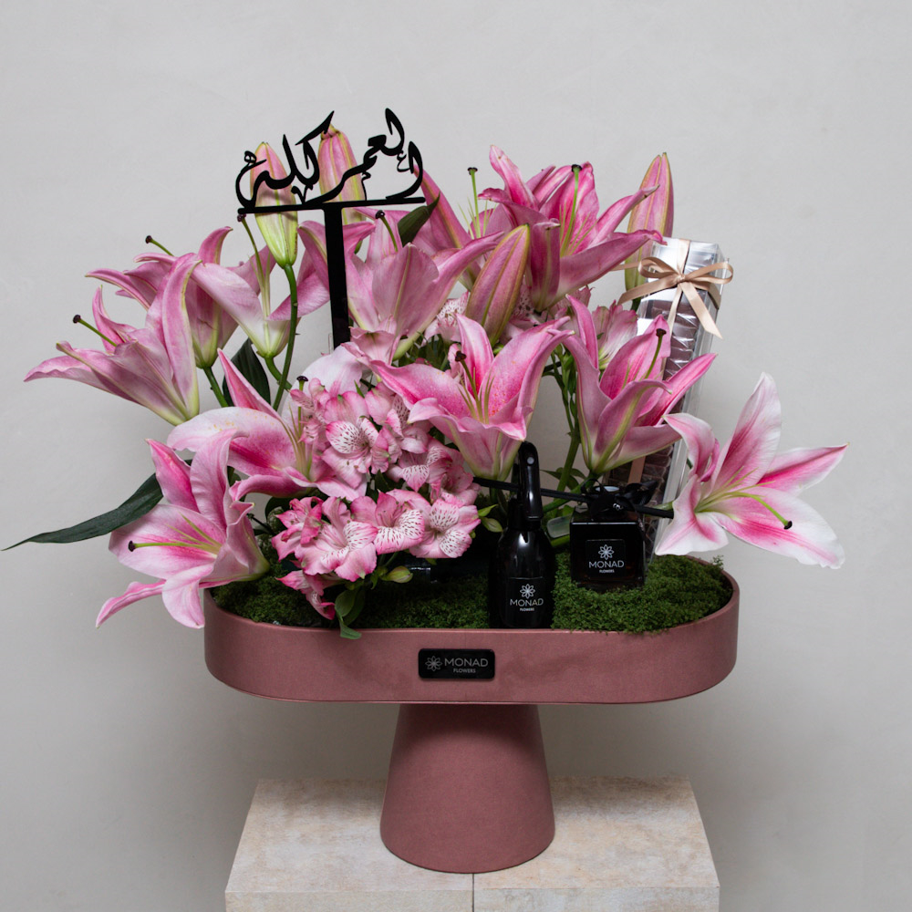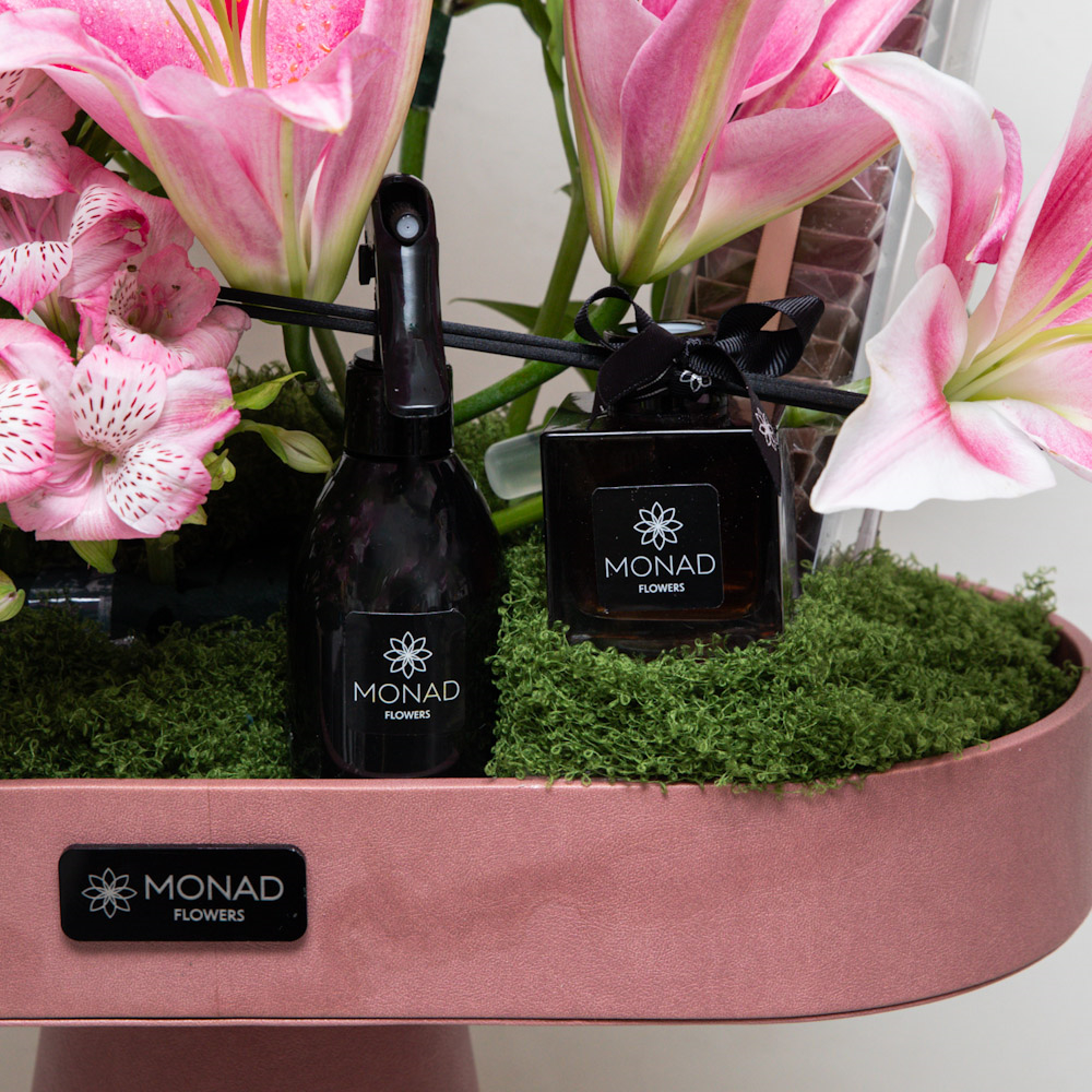 A leather stand that contains lilies and alstroemerias along with a premium fragrance diffuser and perfume and chocolates.