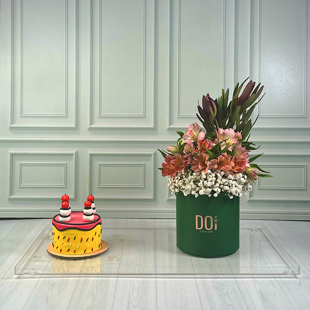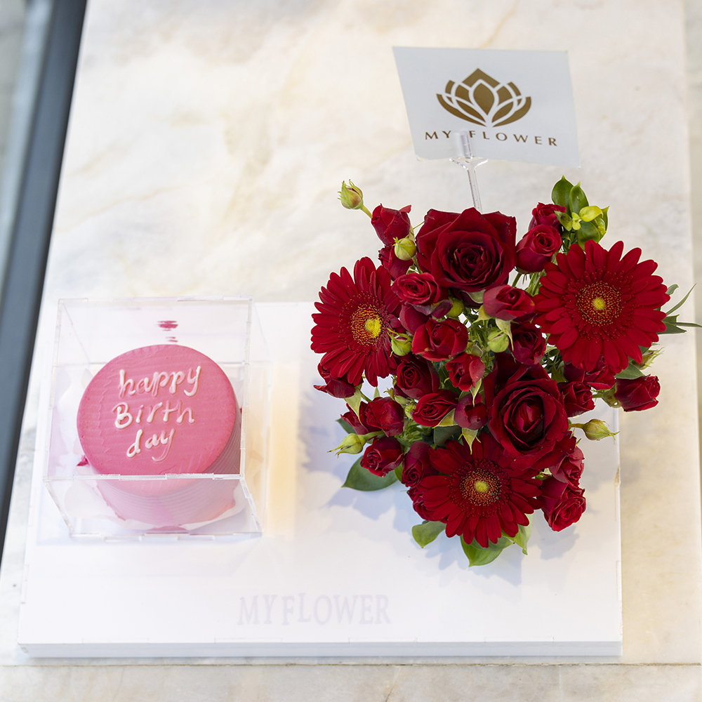 This bouquet contains rose, baby rose, and gerbera flowers with a cake in an acrylic box.