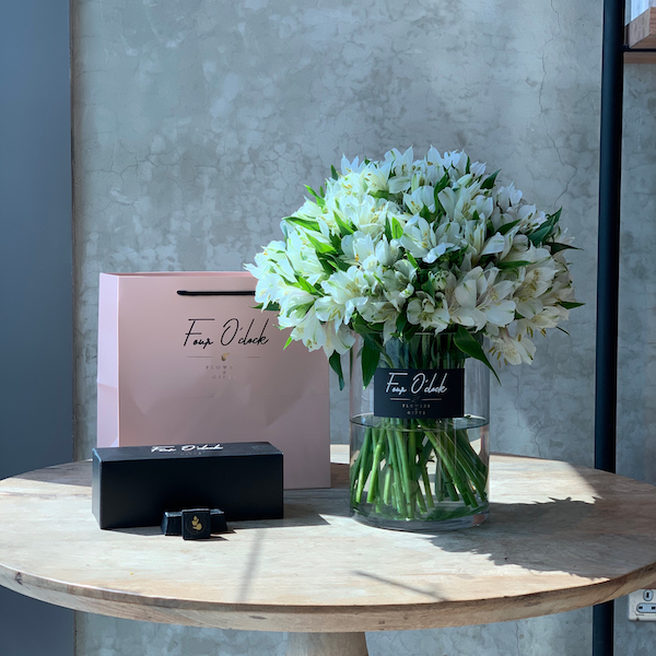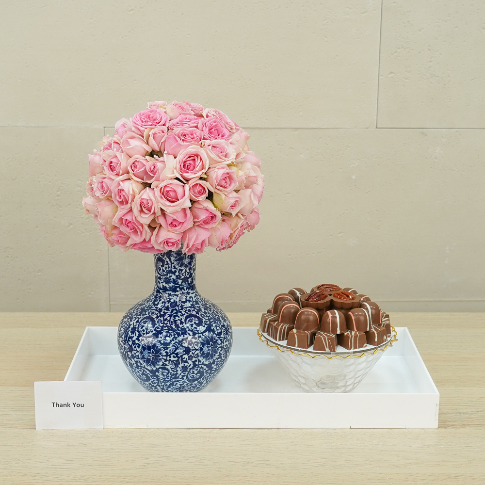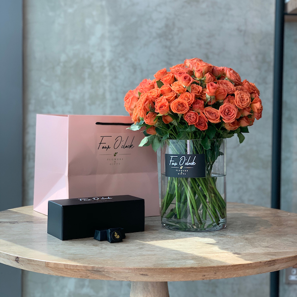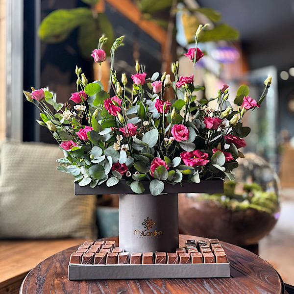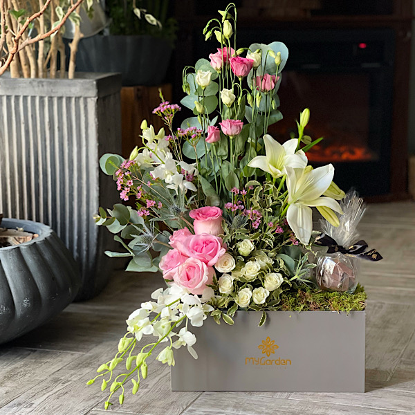 The bouquet contains a mix of orchid, lilies and roses flowers with chocolates.