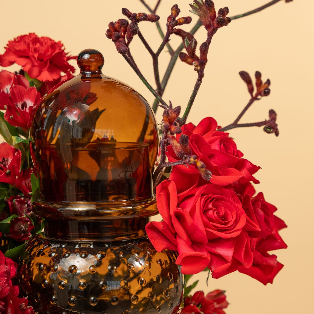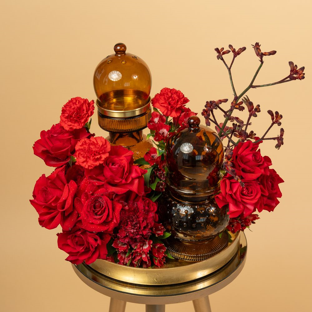 An elegant floral piece featuring two amber glass containers of a mubkhar and candy container, surrounded by roses, alstroemeria, carnation, and kangaroo flowers, presented on an elegant tray.