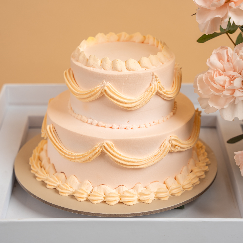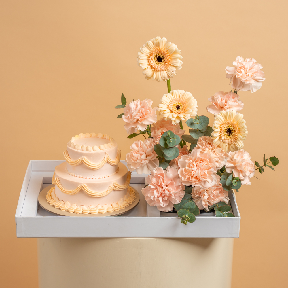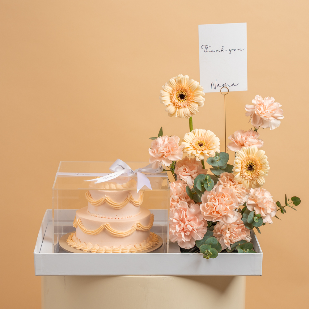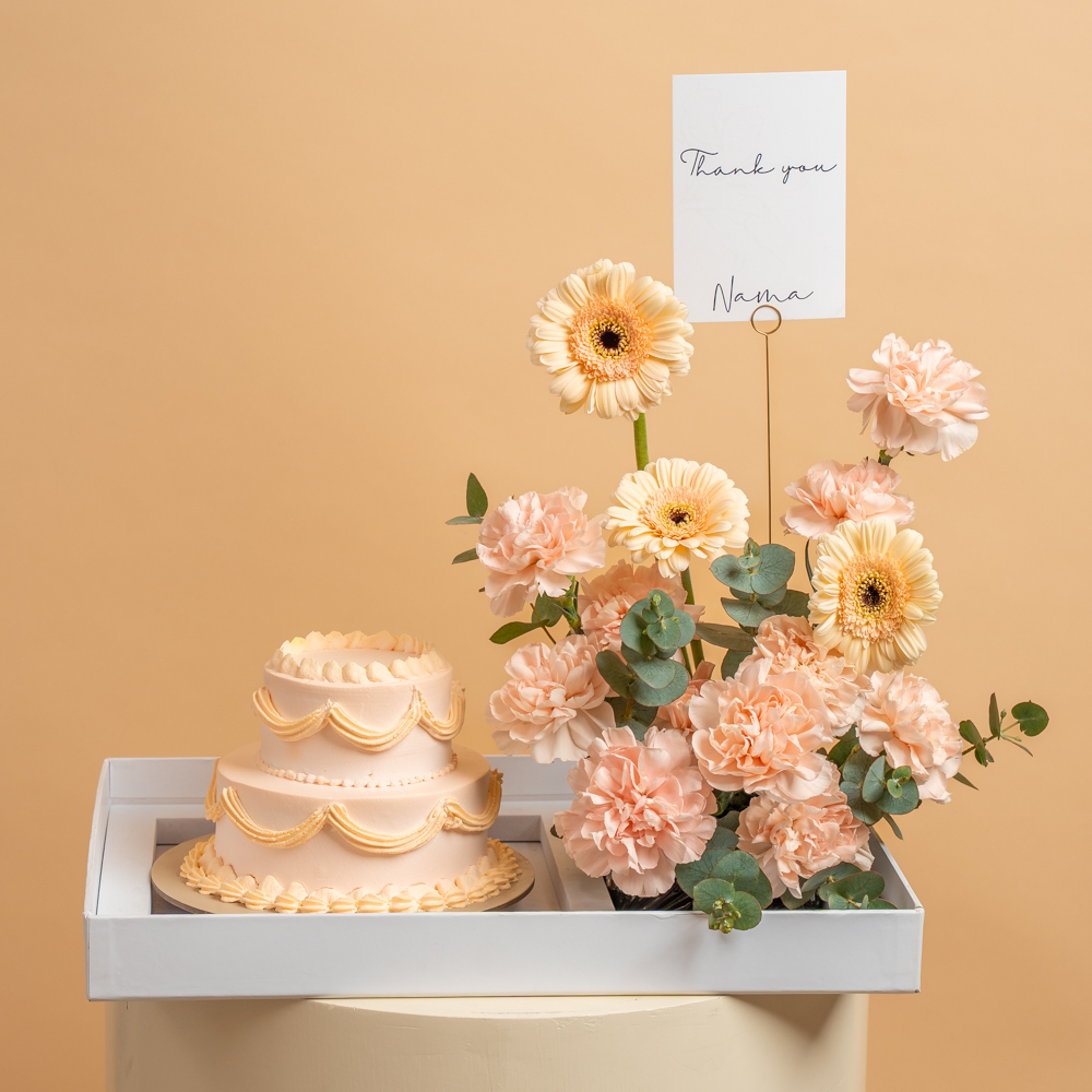 A beautifully arranged appreciation tray featuring soft peach carnations, white carnations, peach gerbera, and fresh green leaves. Paired with a delicious two-layer peach cake, this elegant set is the perfect way to express your heartfelt thanks.