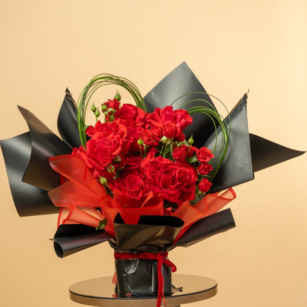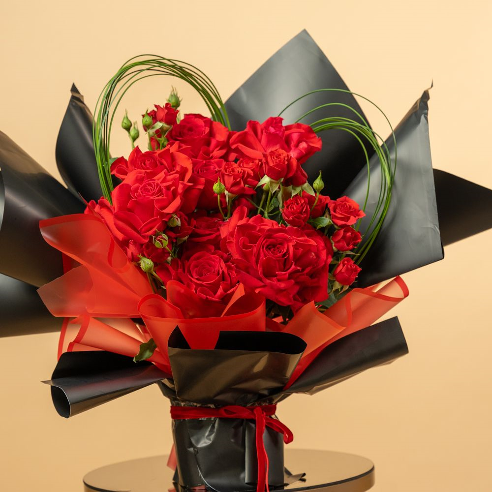 An elegant bouquet, featuring red roses and baby roses flowers with steel grass and black and red wrapping.