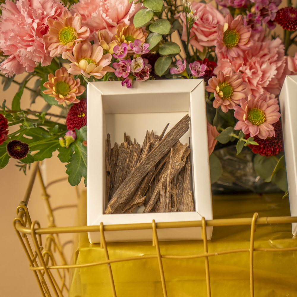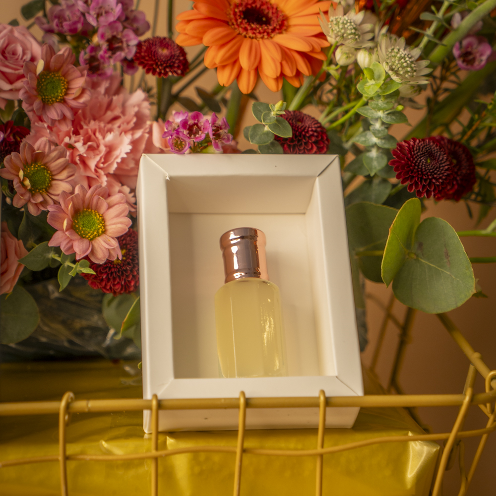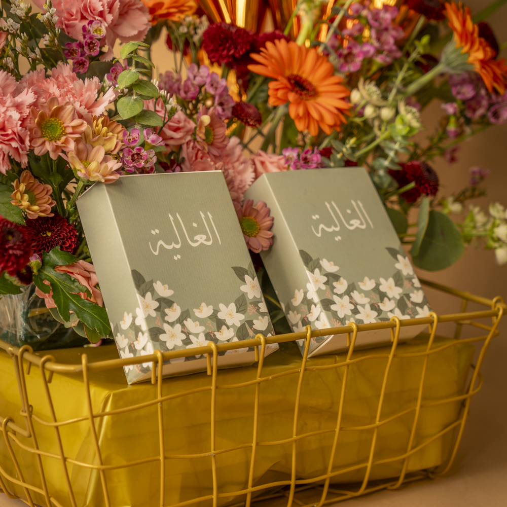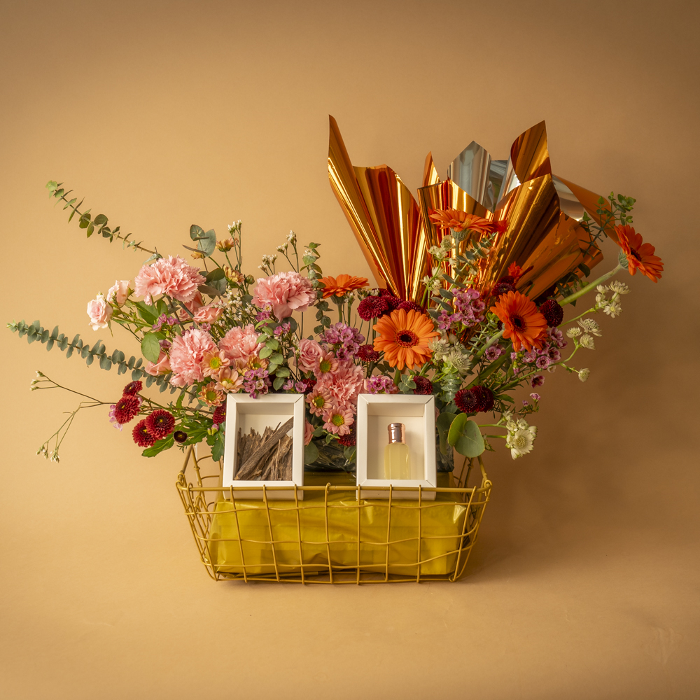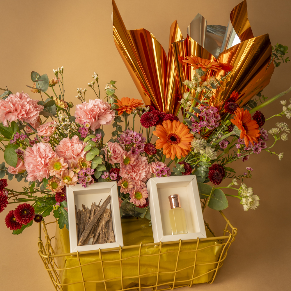 The arrangement features delicate pink carnations, orange gerberas, and red chrysanthemums, accented with touches of greens, all elegantly presented in a golden metal basket tray. Additionally, a thoughtful addition of 1 tolah of bukhour and 1 tolah of special musk provides a charming and luxurious touch to the arrangement, making it a perfect gift for any occasion.