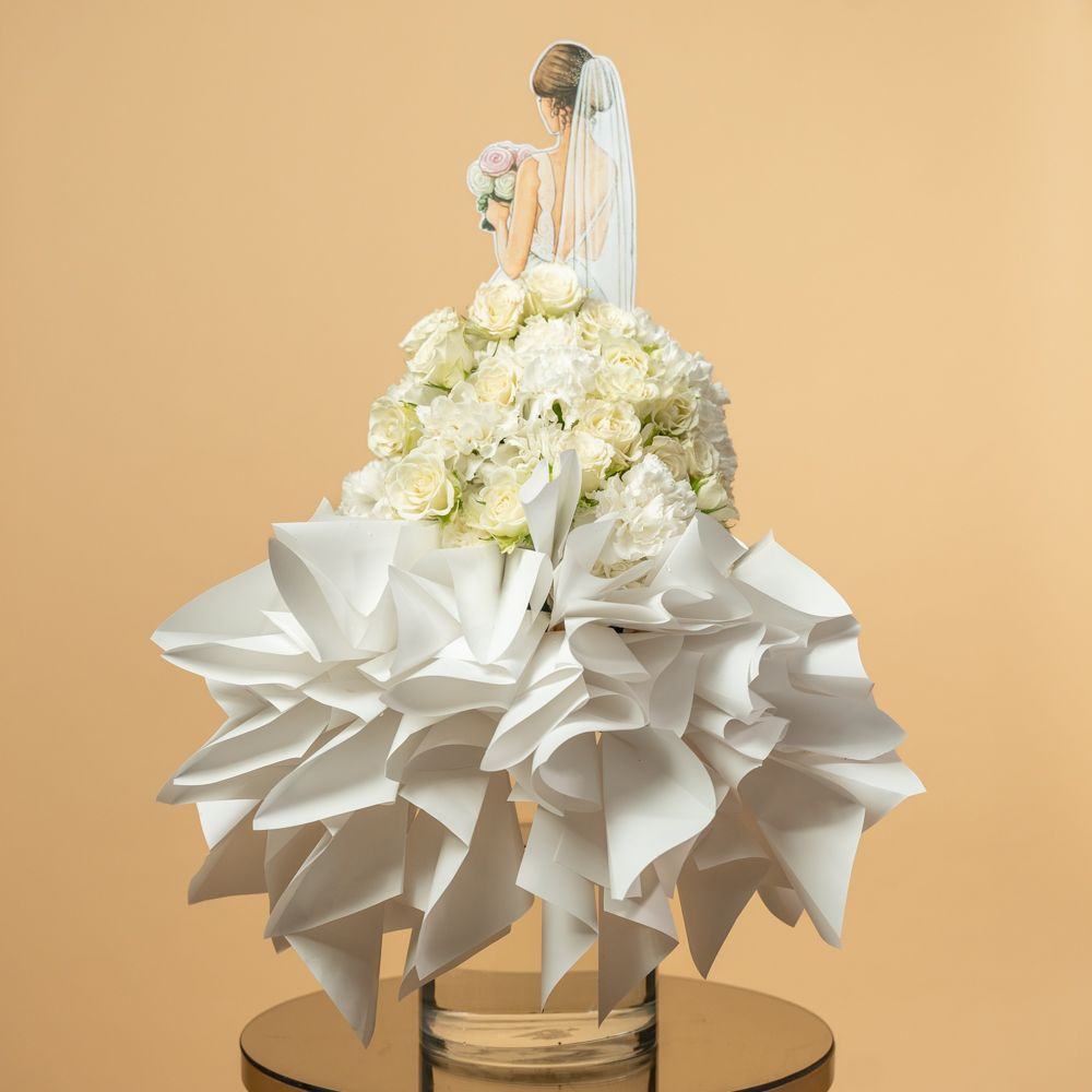 A creative white floral arrangement consists of lovely flowers like carnation and baby roses, designed to resemble a wedding dress, often used as a gift.