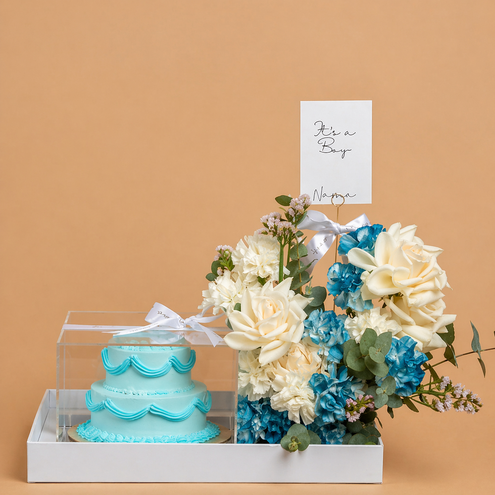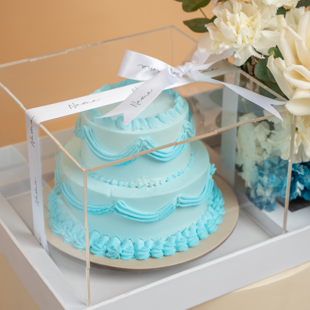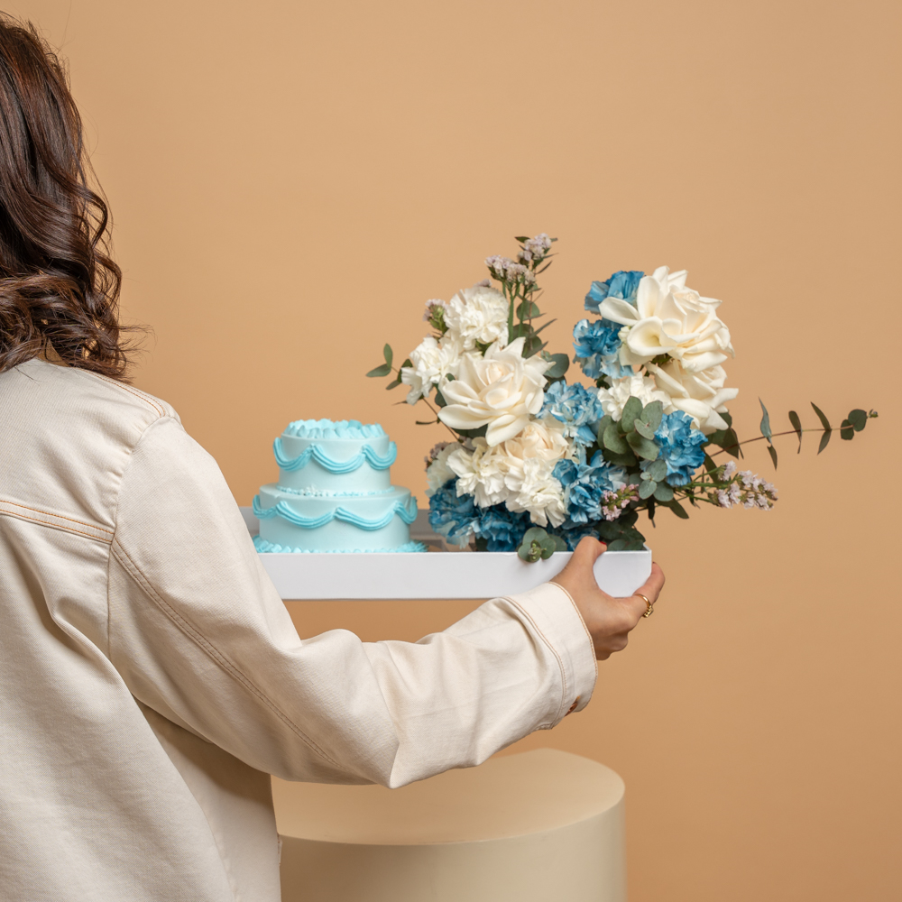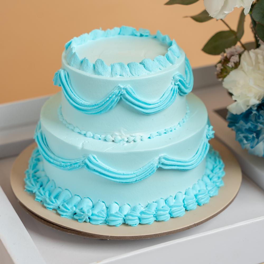 A blue double-layer cake, size 10x12 in a long tray box with a card, consisting of floral decorations like roses, carnations, and eucalyptus leaves.