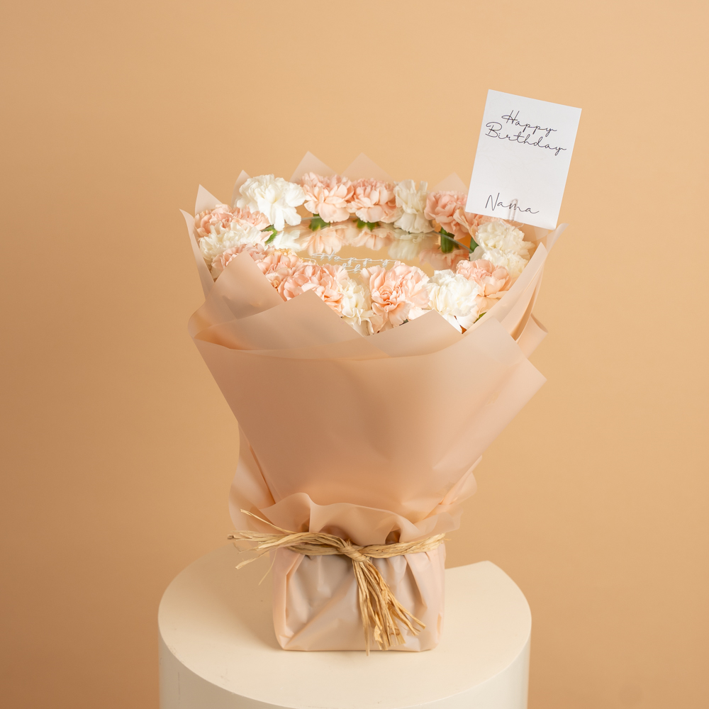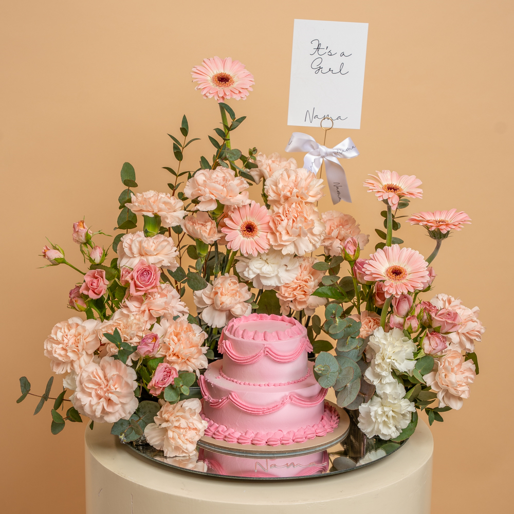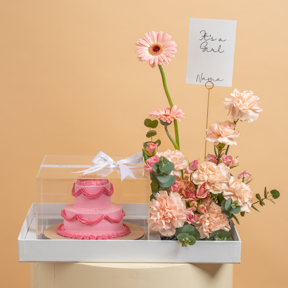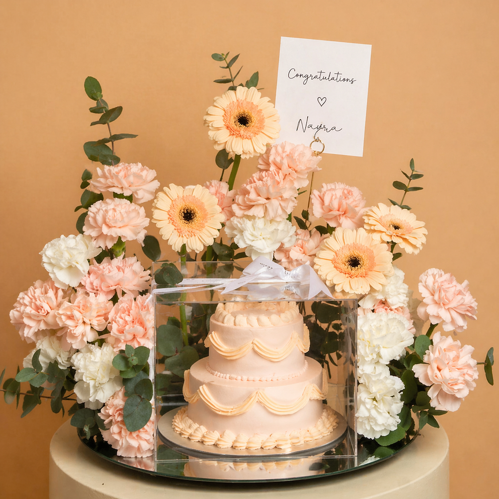 A blue double-layer cake, size 10x12 in a long tray box with a card, consisting of floral decorations like roses, carnations, and eucalyptus leaves.