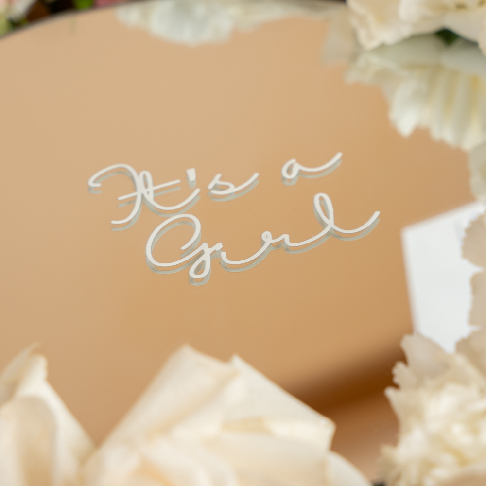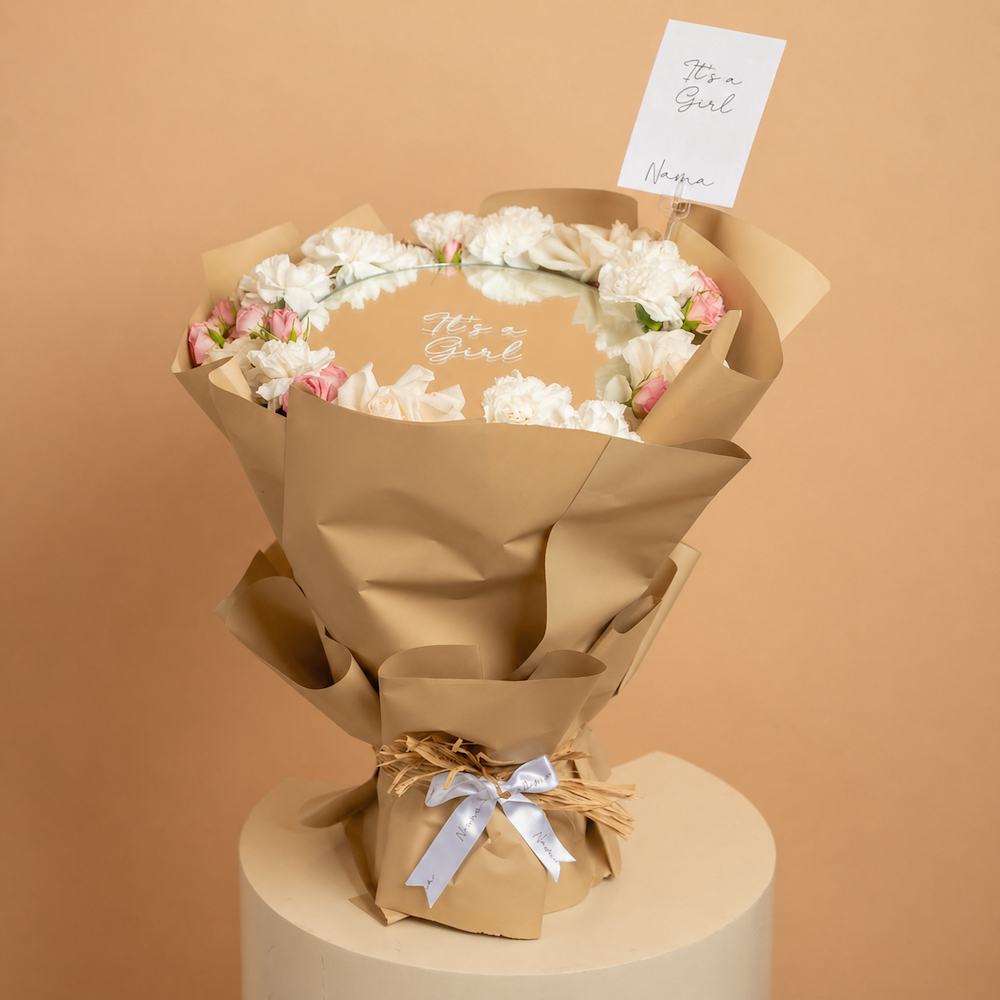 A charming hand bouquet featuring carnations and baby roses, elegantly wrapped in simple paper. Designed with a round mirror at the center, allowing you to add your own customized message. Includes 3 helium balloons.