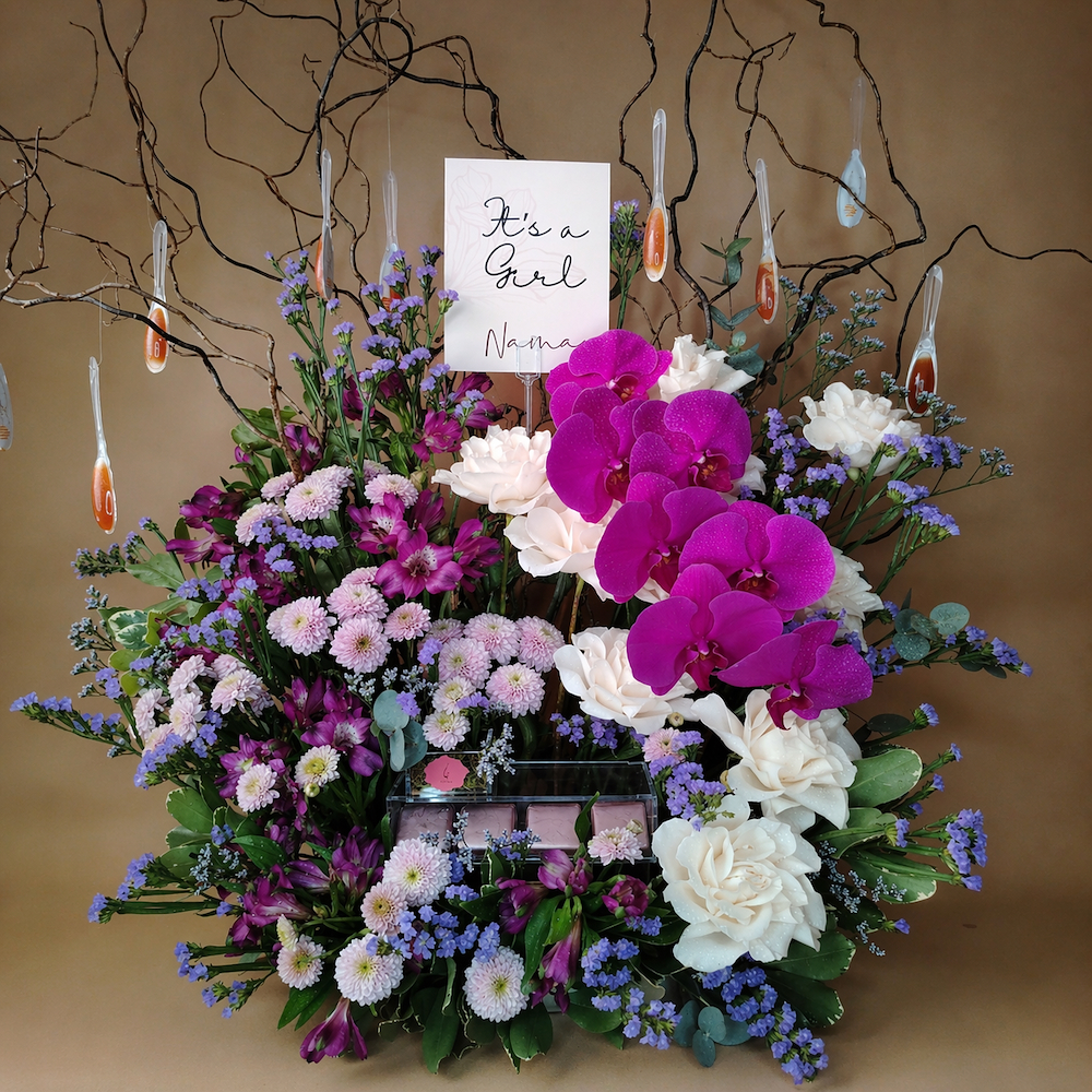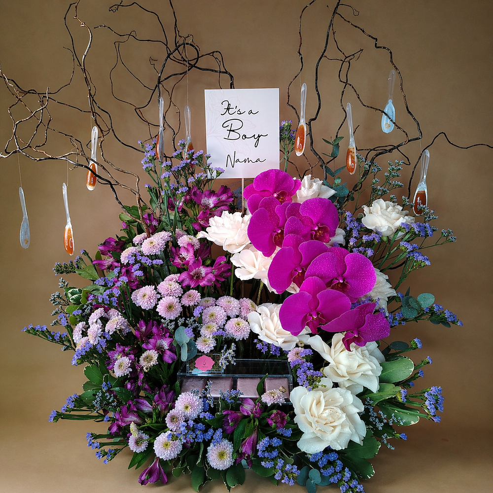 An attractive arrangement consists of phalaenopsis, statice, roses, chrysanthemums, alstroemerias, and lush greens. Including chocolates and 10 honey spoons.