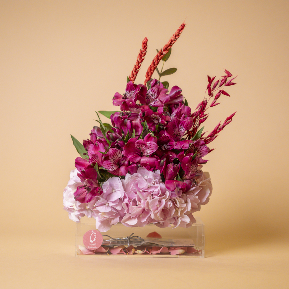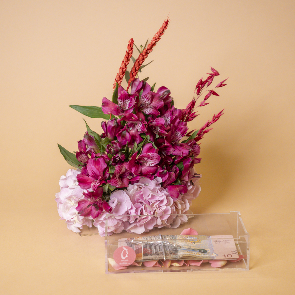 A charming bouquet featuring alstroemerias and delicate hydrangeas with an empty money box. Note: Money is not included.