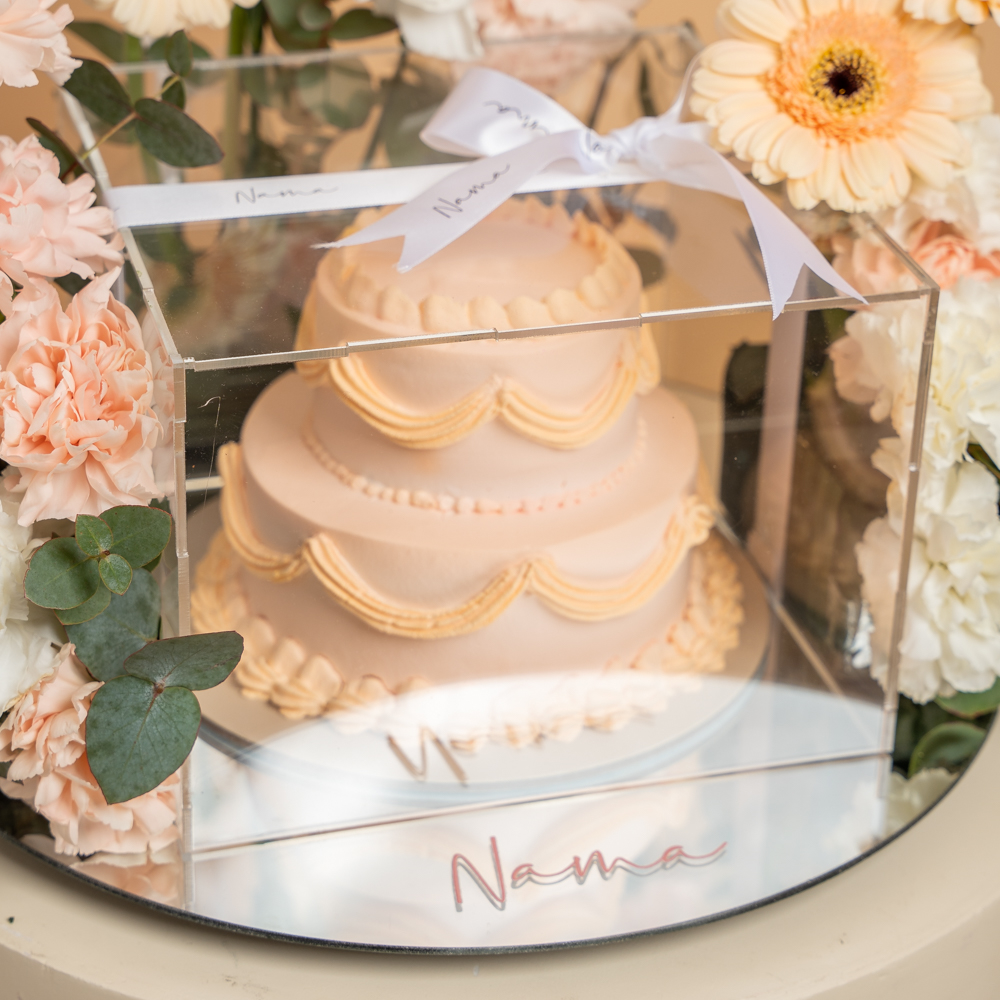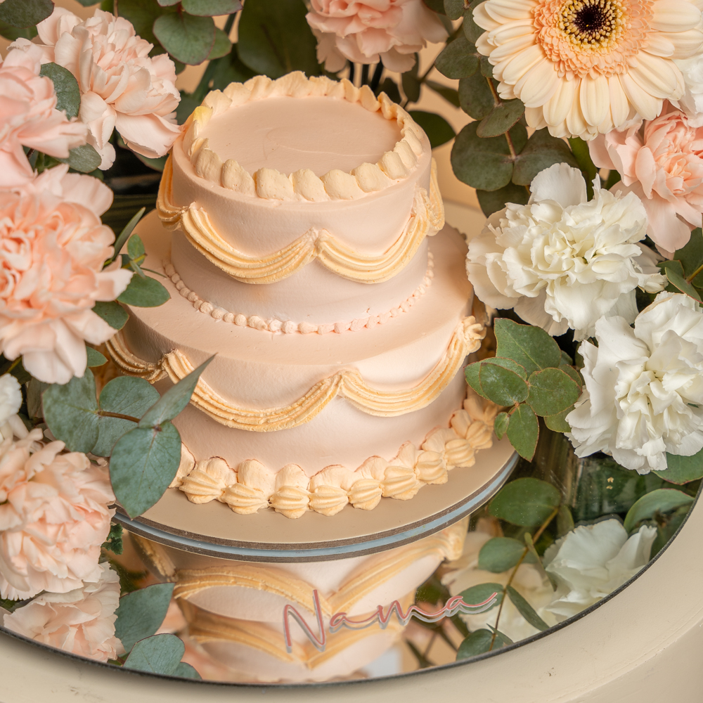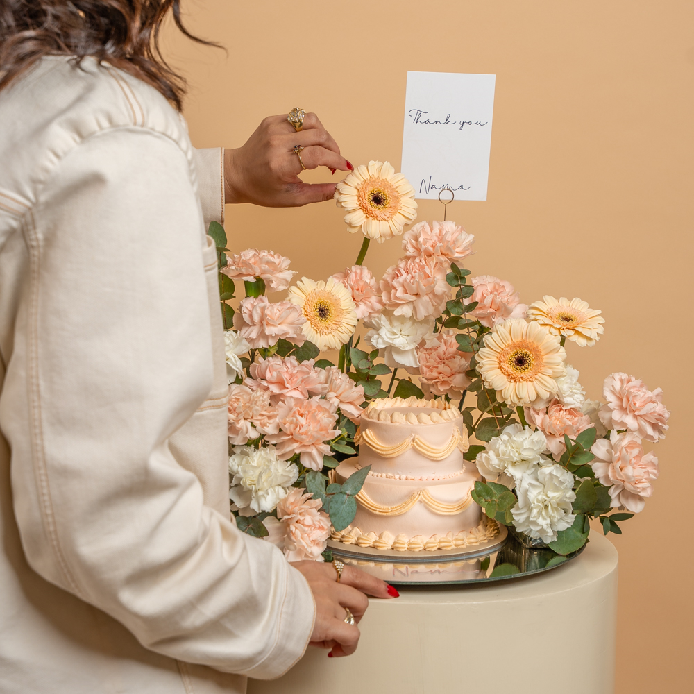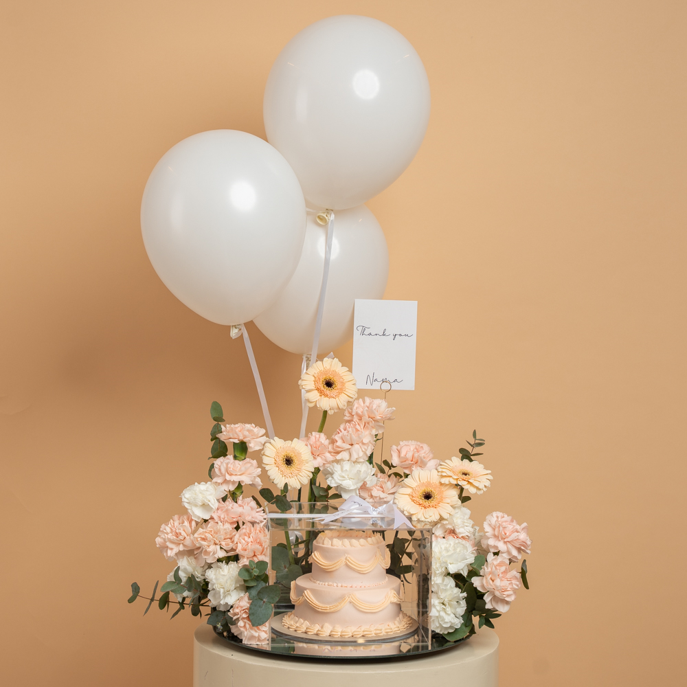 A beautiful peach double-layer cake (10x12) elegantly presented on a round mirror tray, featuring a customized “Thank You” card. Decorated with fresh floral accents including carnations, gerbera, and eucalyptus leaves for a soft and graceful look. Comes complete with 3 helium balloons, making it a perfect appreciation gift.