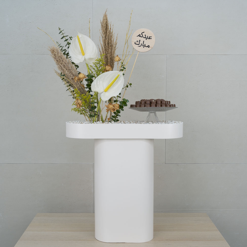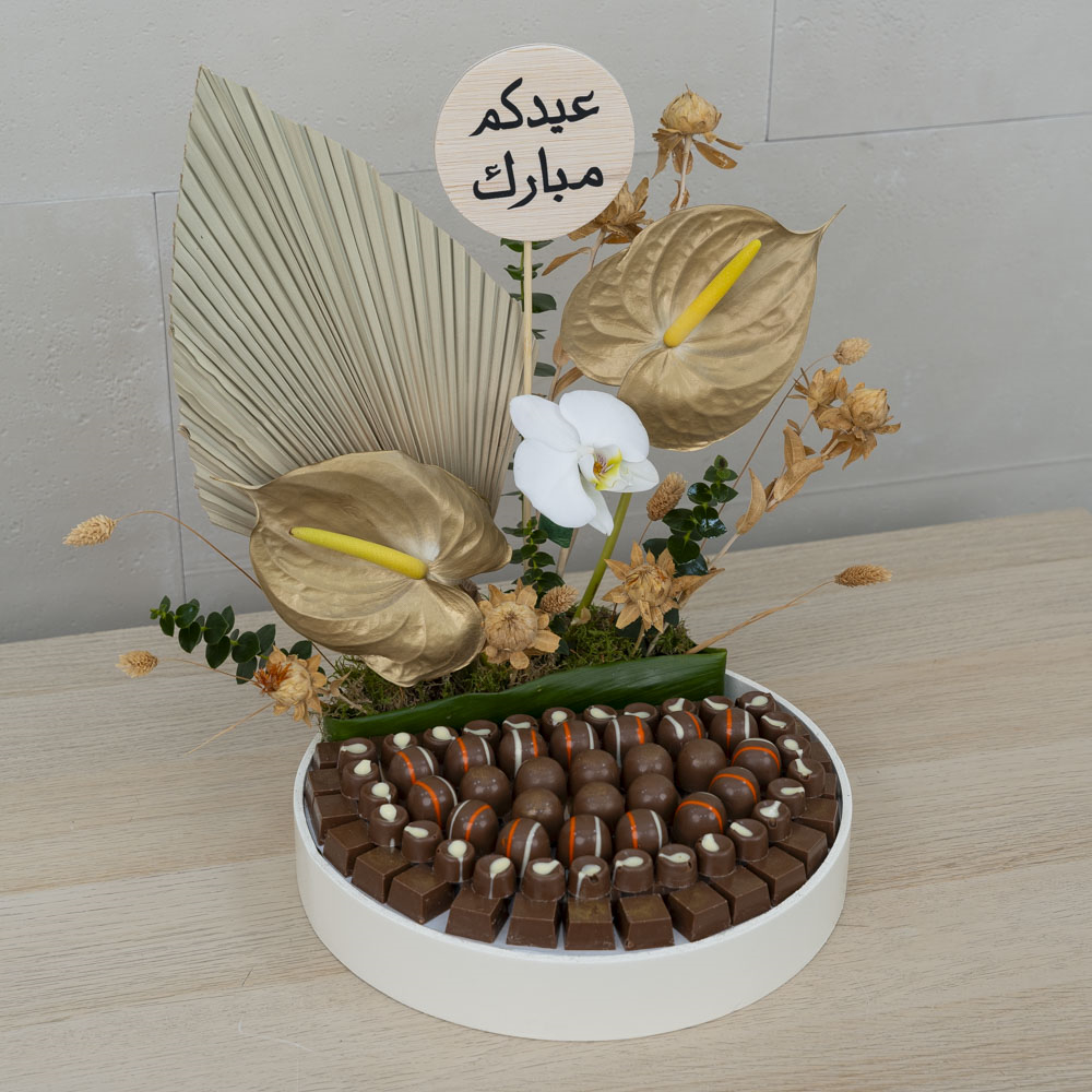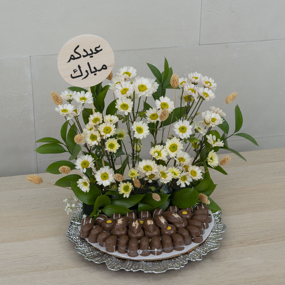 This beautifully designed bouquet contains baby roses and gerberas arranged on a wooden stand. It also includes a chocolate cake.