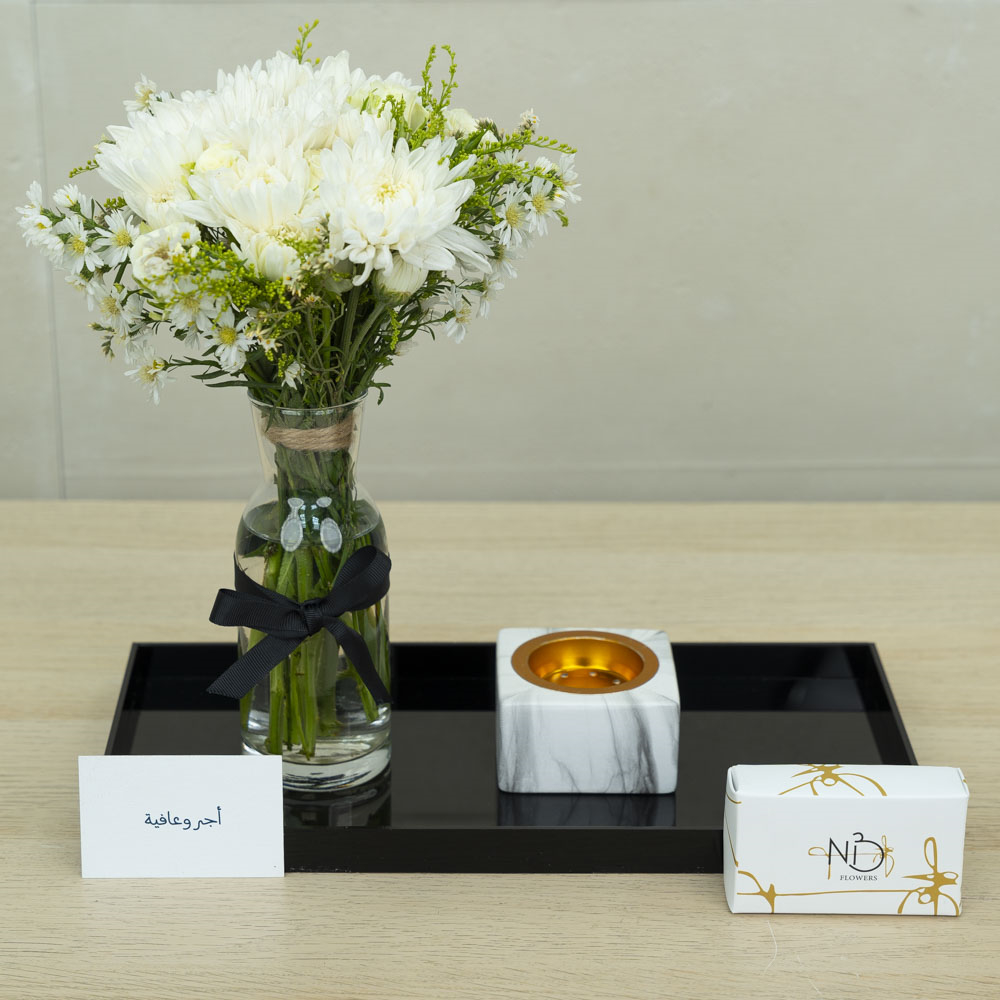 This bouquet contains chrysanthemums along with a mubkhar and chocolates.