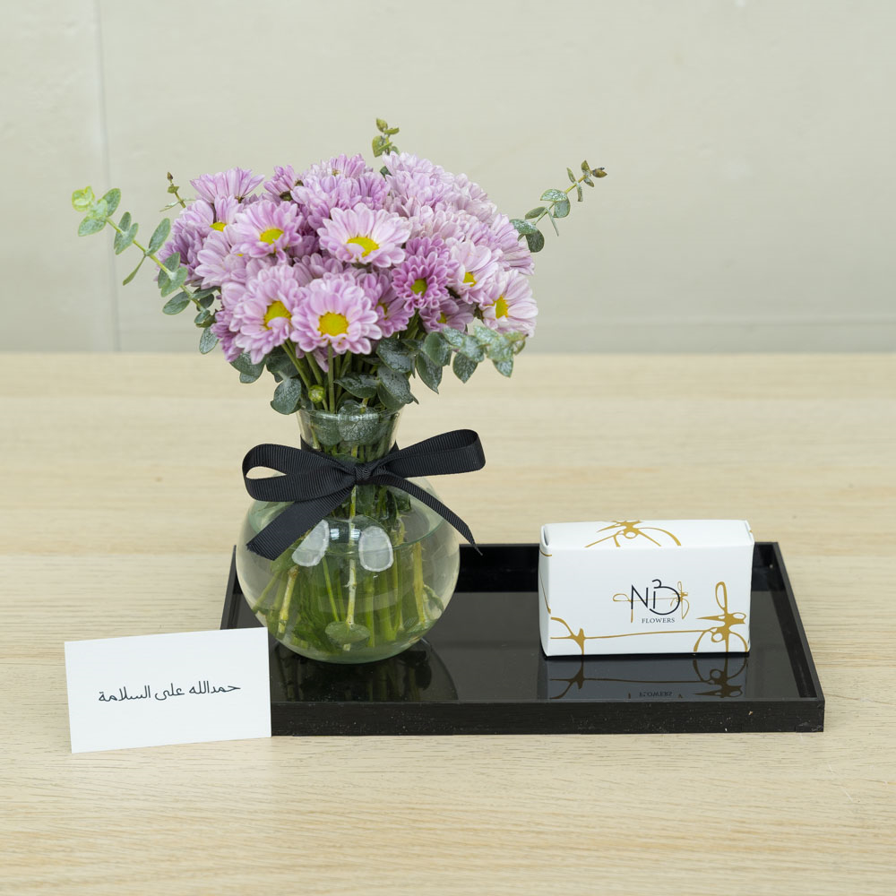 A tray that contains chrysanthemums along with chocolates.