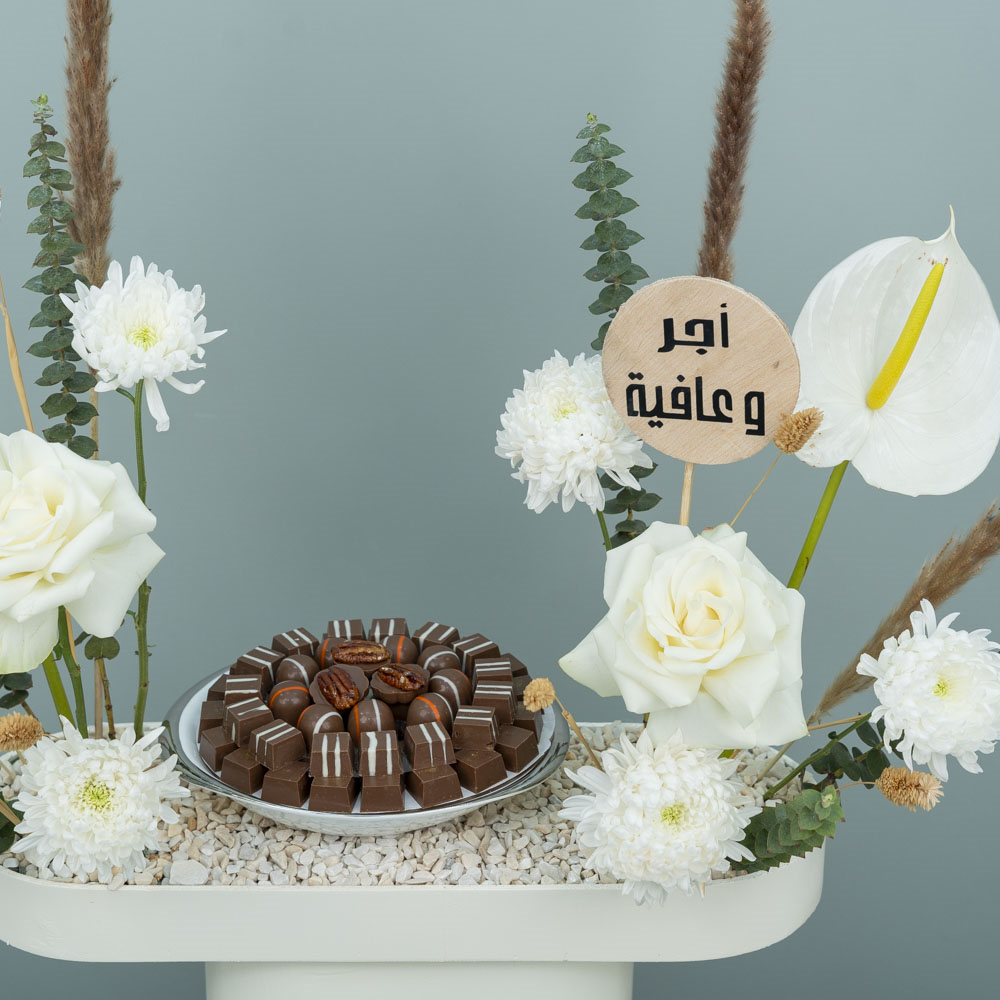 This bouquet contains roses and chrysanthemums with chocolates.