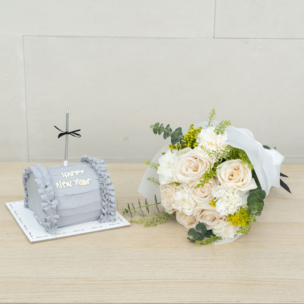 A hand bouquet that contains roses and carnations along with a chocolate cake.