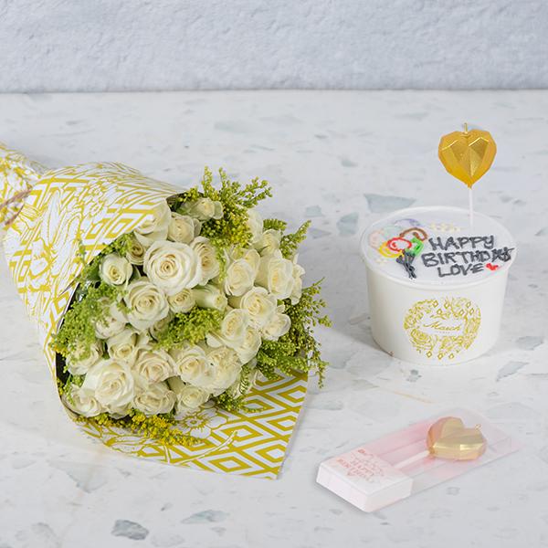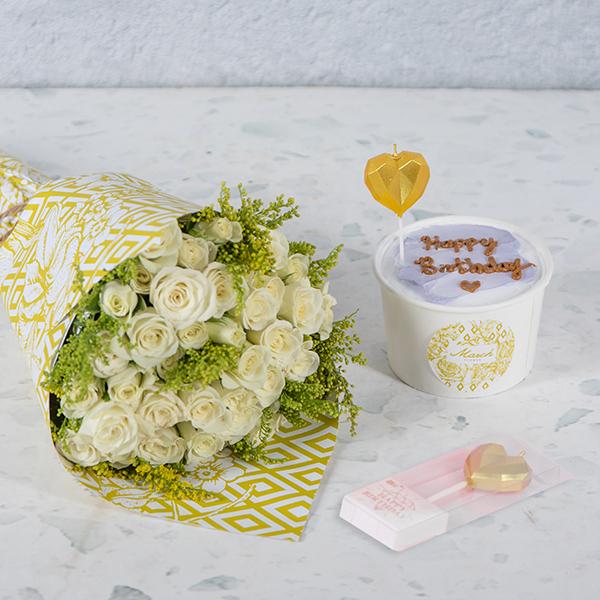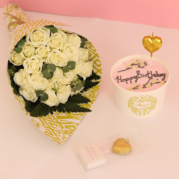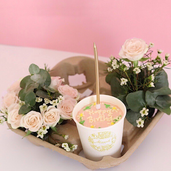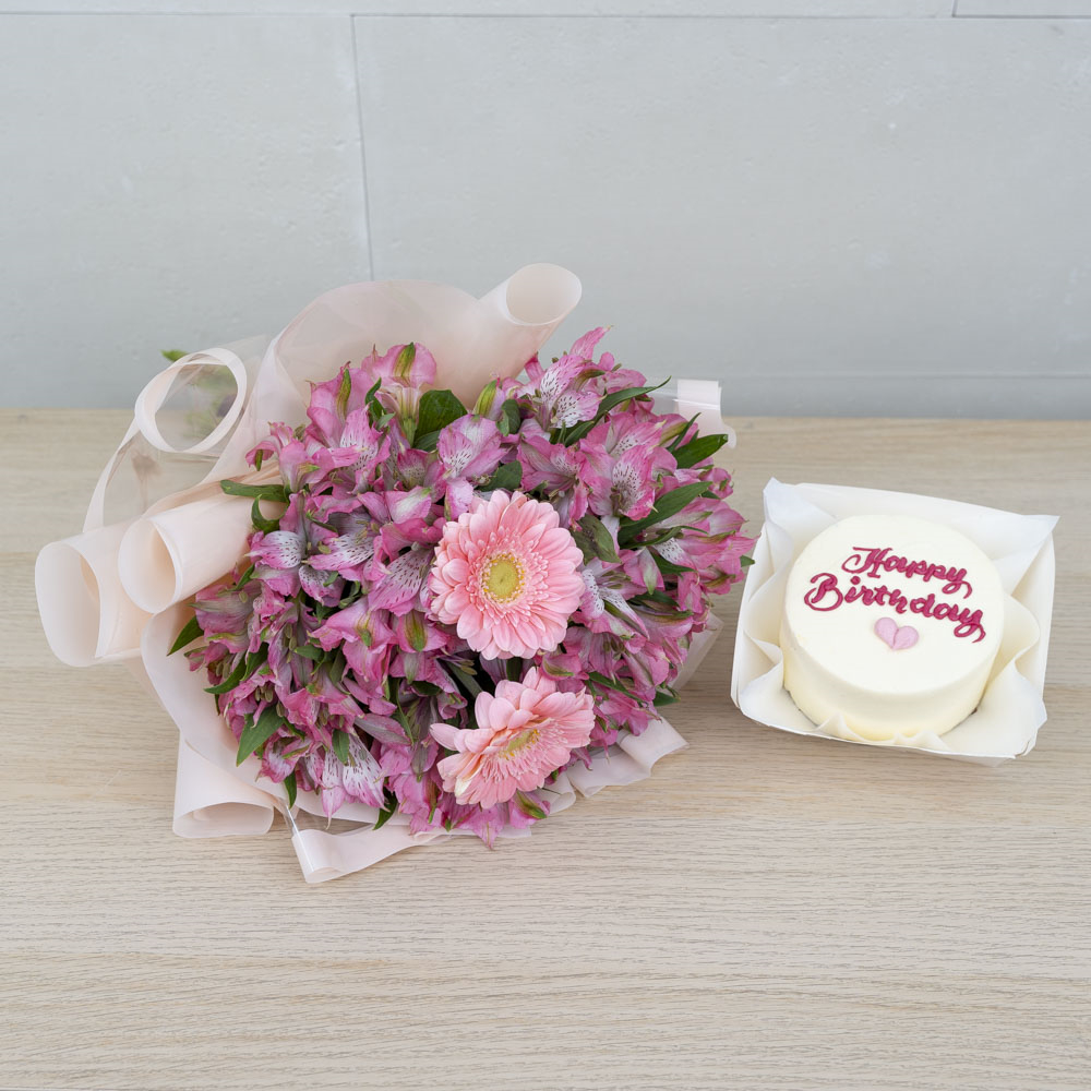 A hand bouquet containing pink alstroemerias and gerberas with a mini chocolate cake.