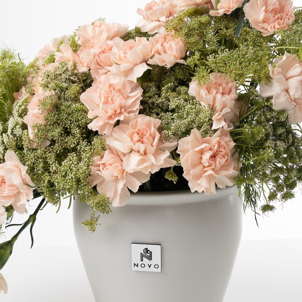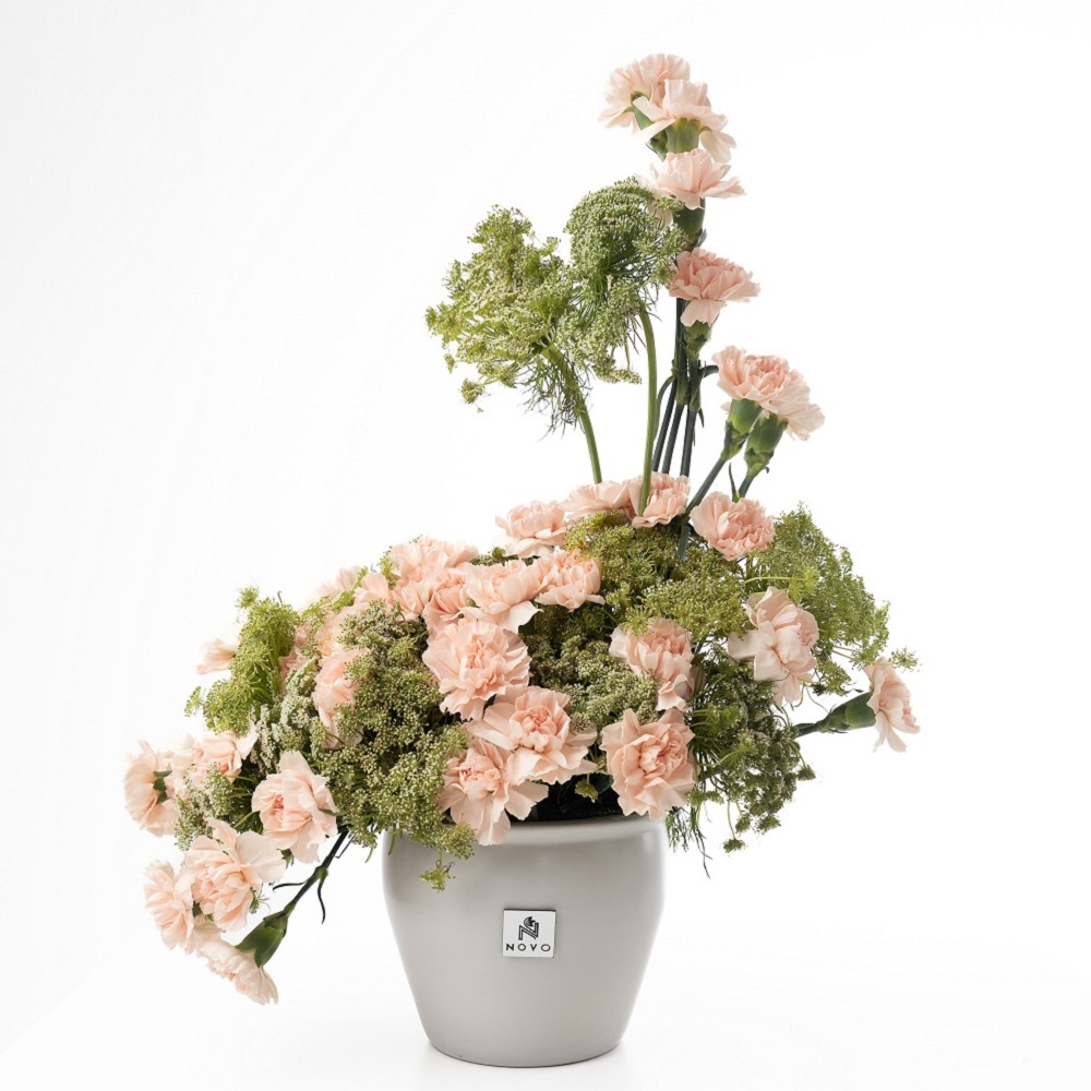 A modern, sculptural mix of soft peach carnations and ammi majus flowers in a minimalist grey pot.