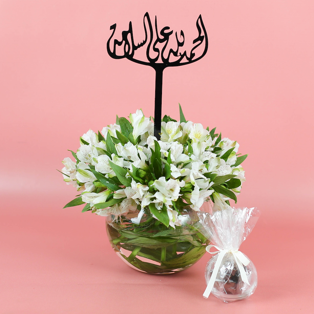 A bouquet featuring beautiful white alstroemerias with chocolates.