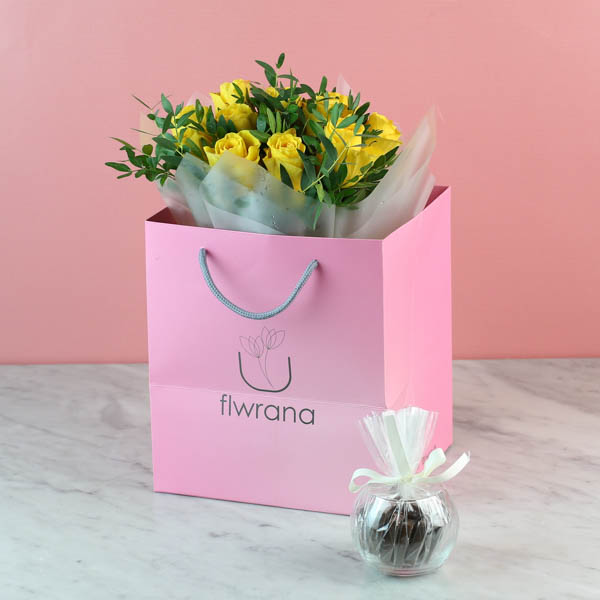 This bouquet contains roses flowers with chocolates.