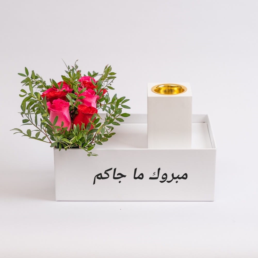 A bouquet containing roses and an incense burner.