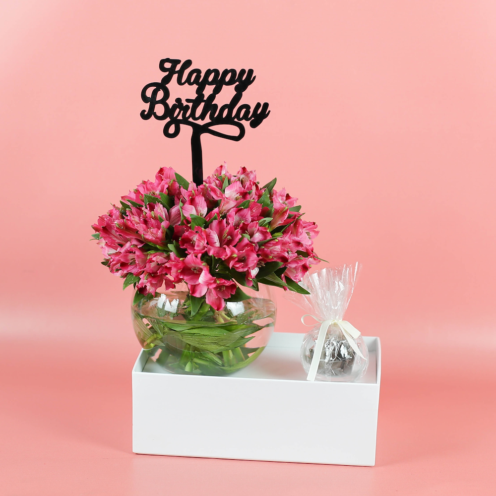 A bouquet arranged with beautiful alstroemeria flowers with chocolates.