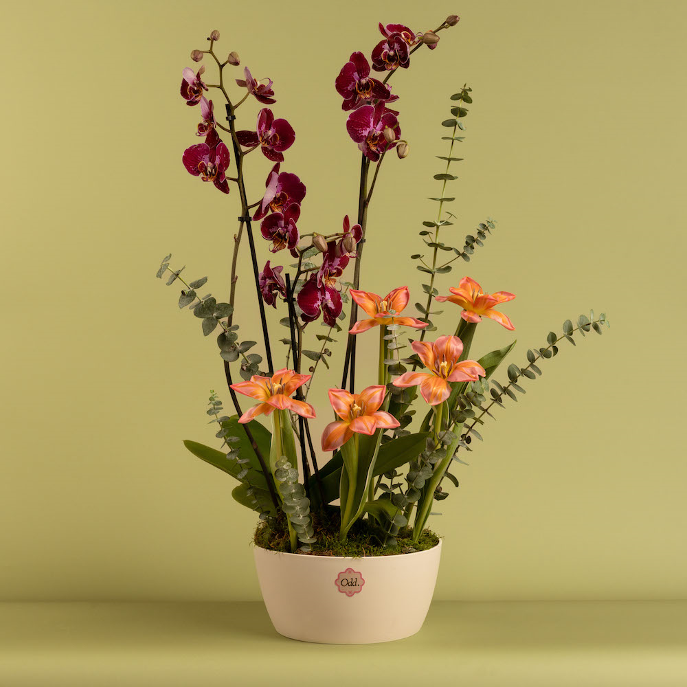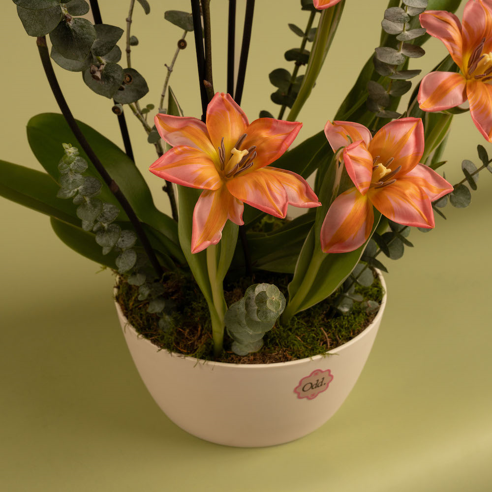 An elegant vase featuring beautiful purple plant orchid with a special 5 pcs pink tulips and baby eucalyptus.