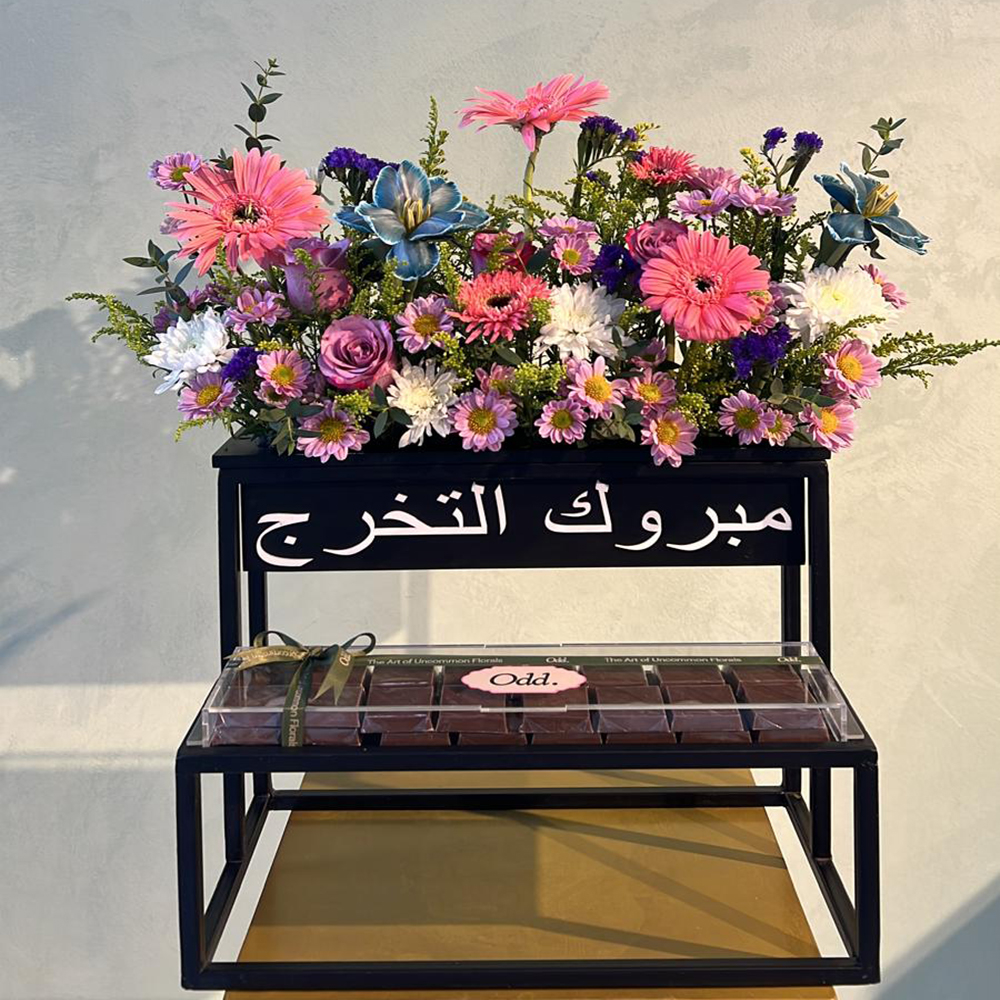 This bouquet contains pink orchids and lavender flowers in glass vase.