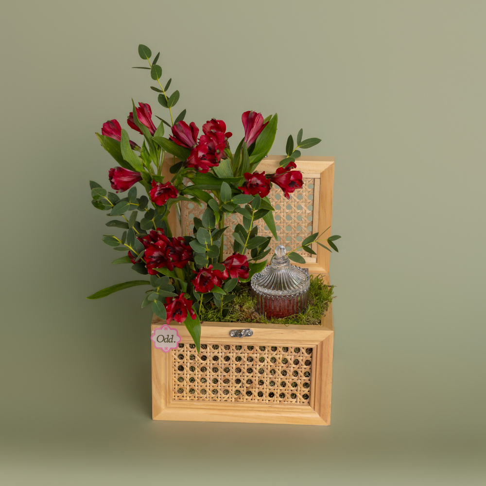 A rattan box featuring alstroemeria flowers with 1g of saffron.