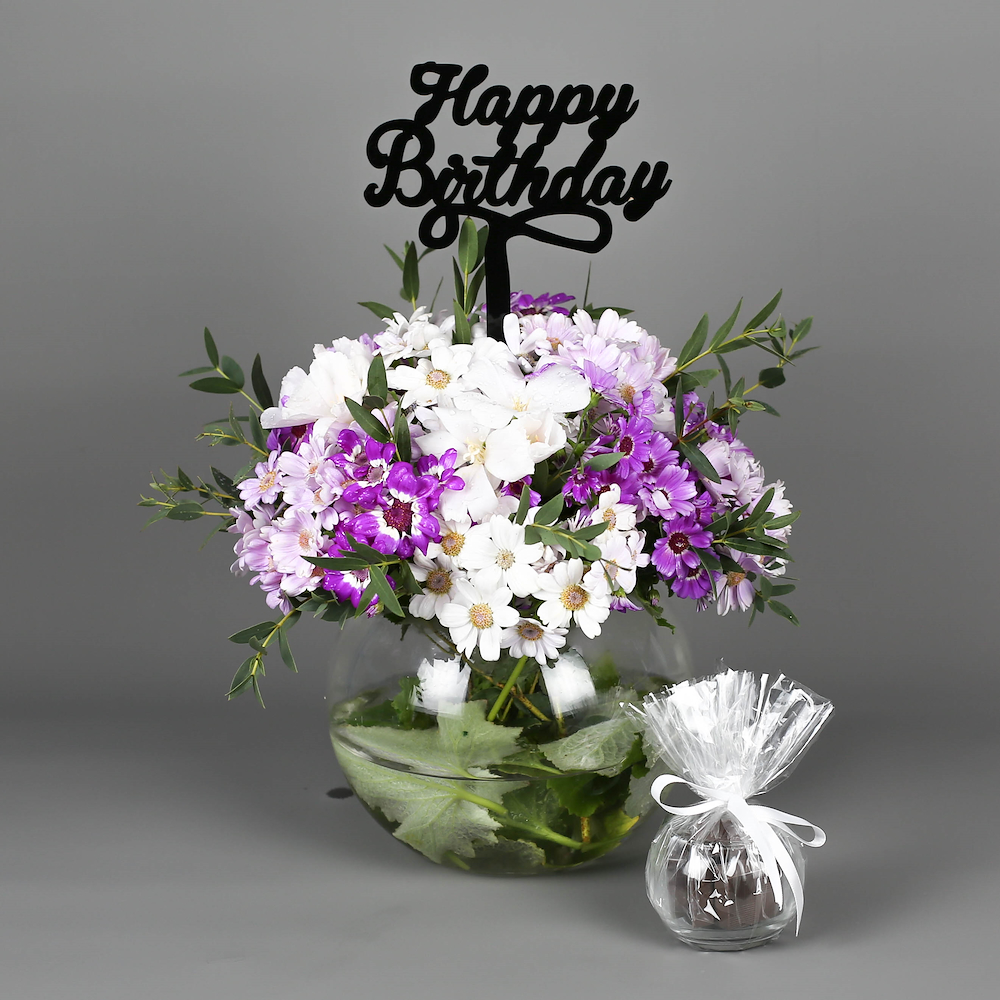 A bouquet featuring beautiful mixed flowers with chocolates.
