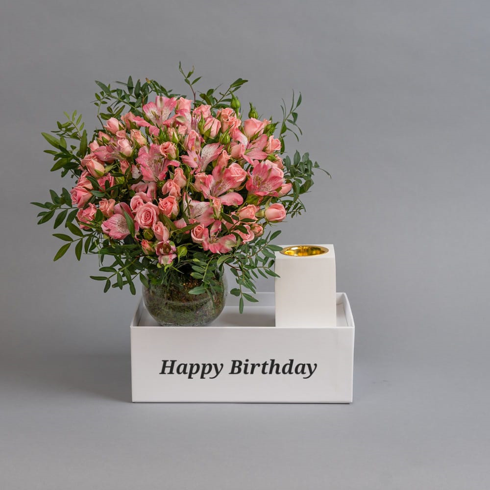 A bouquet containing roses and an incense burner.